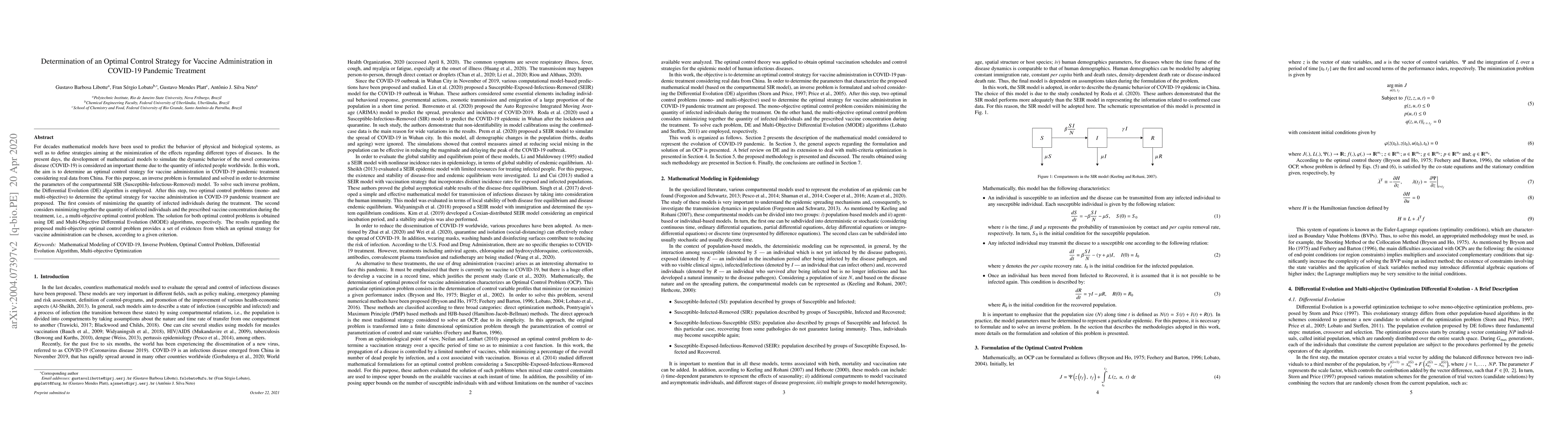 This paper develops mathematical models to simulate COVID-19 dynamics and determines an optimal control strategy for vaccine administration using real data from China. It employs the Differential Evolution algorithm to solve an inverse problem for parameter estimation in a SIR model, and uses DE and Multi-Objective Differential Evolution (MODE) to solve optimal control problems for minimizing infections and vaccine usage.