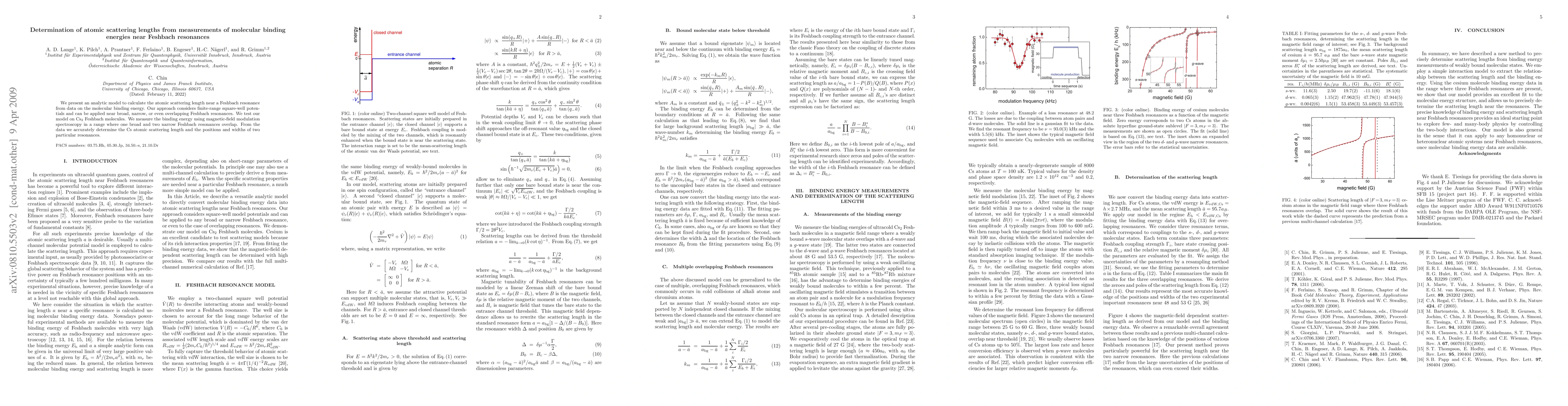 This paper proposes an analytic model to calculate atomic scattering lengths from molecular binding energy data near Feshbach resonances, validated using Cs$_2$ molecules. The model accurately determines the scattering length and resonance parameters in a complex magnetic-field modulation spectroscopy setup.