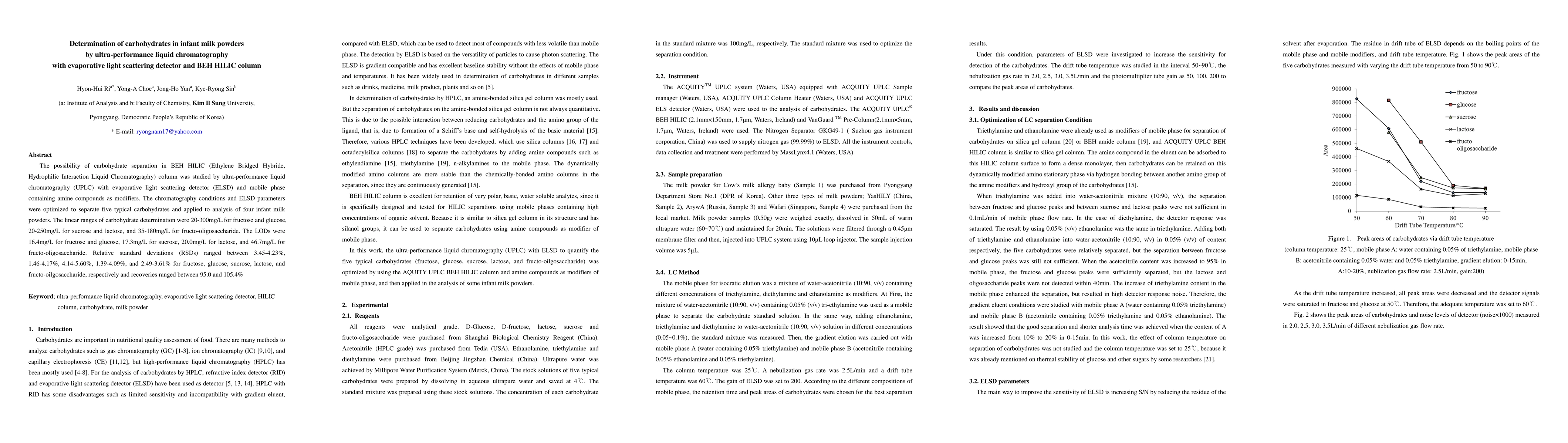 The possibility of carbohydrate separation in BEH HILIC (Ethylene Bridged Hybride, Hydrophilic Interaction Liquid Chromatography) column was studied by ultra-performance liquid chromatography (UPLC) with evaporative light scattering detector (ELSD) and mobile phase containing amine compounds as modifiers. The chromatography conditions and ELSD parameters were optimized to separate five typical carbohydrates and applied to analysis of four infant milk powders. The linear ranges of carbohydrate determination were 20-300mg/L for fructose and glucose, 20-250mg/L for sucrose and lactose, and 35-180mg/L for fructo-oligosaccharide. The LODs were 16.4mg/L for fructose and glucose, 17.3mg/L for sucrose, 20.0mg/L for lactose, and 46.7mg/L for fructo-oligosaccharide. Relative standard deviations (RSDs) ranged between 3.45-4.23%, 1.46-4.17%, 4.14-5.60%, 1.39-4.09%, and 2.49-3.61% for fructose, glucose, sucrose, lactose, and fructo-oilgosaccharide, respectively and recoveries ranged between 95.0 and 105.4%