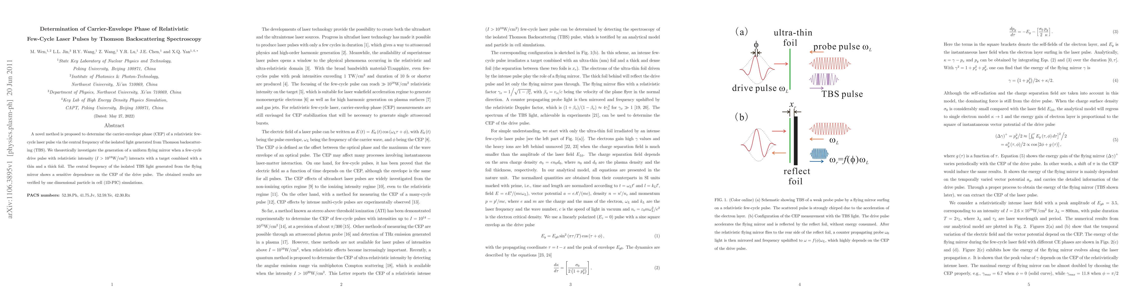 This paper proposes a method to determine the carrier-envelope phase of relativistic few-cycle laser pulses using Thomson backscattering spectroscopy, where the central frequency of scattered light depends on the CEP. The method is validated through theoretical analysis and 1D-PIC simulations.