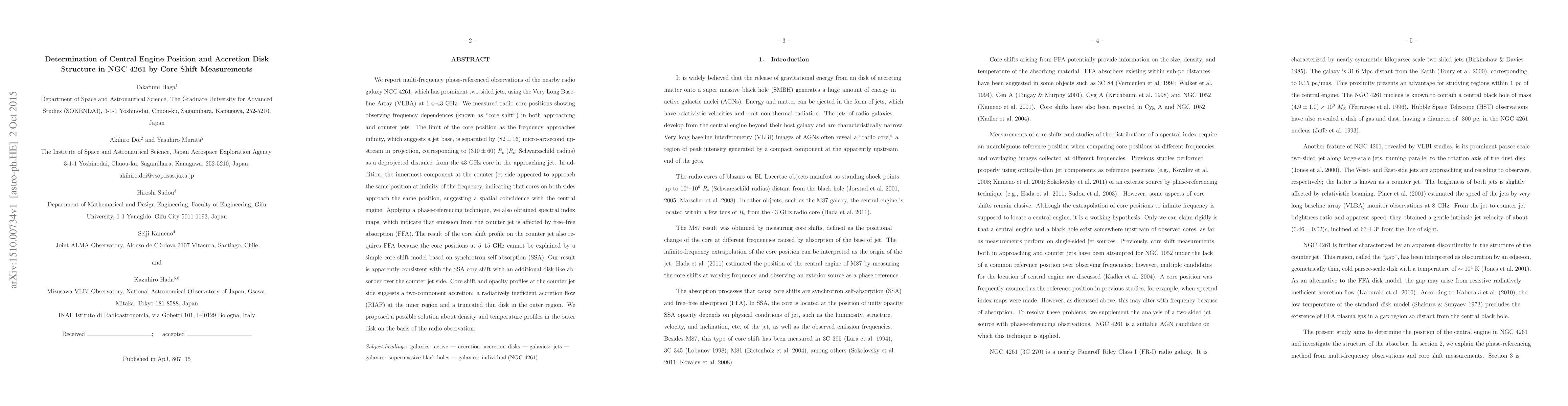 This paper uses Very Long Baseline Array observations to determine the central engine position and accretion disk structure in NGC 4261, revealing a spatial coincidence of jet cores with the central engine. Spectral index maps suggest free-free absorption affecting the counter jet, indicating a two-component accretion disk model.