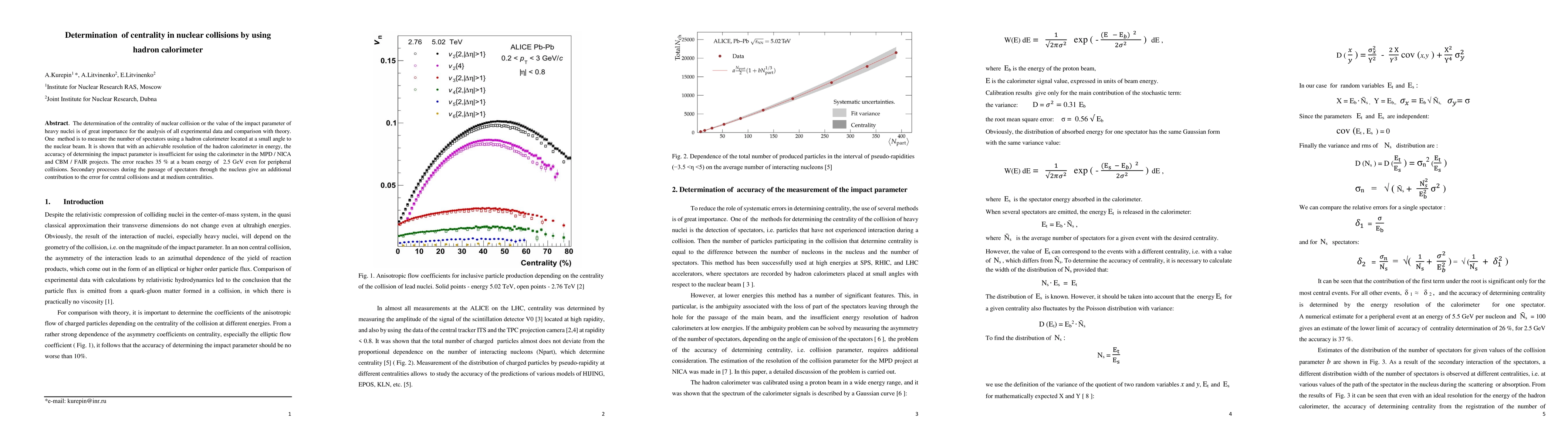 The determination of the centrality of nuclear collision or the value of the impact parameter of heavy nuclei is of great importance for the analysis of all experimental data and comparison with theory. One method is to measure the number of spectators using a hadron calorimeter located at a small angle to the nuclear beam. It is shown that with an achievable resolution of the hadron calorimeter in energy, the accuracy of determining the impact parameter is insufficient for using the calorimeter in the MPD / NICA and CBM / FAIR projects. The error reaches 35 % at a beam energy of 2.5 GeV even for peripheral collisions. Secondary processes during the passage of spectators through the nucleus give an additional contribution to the error for central collisions and at medium centralities.