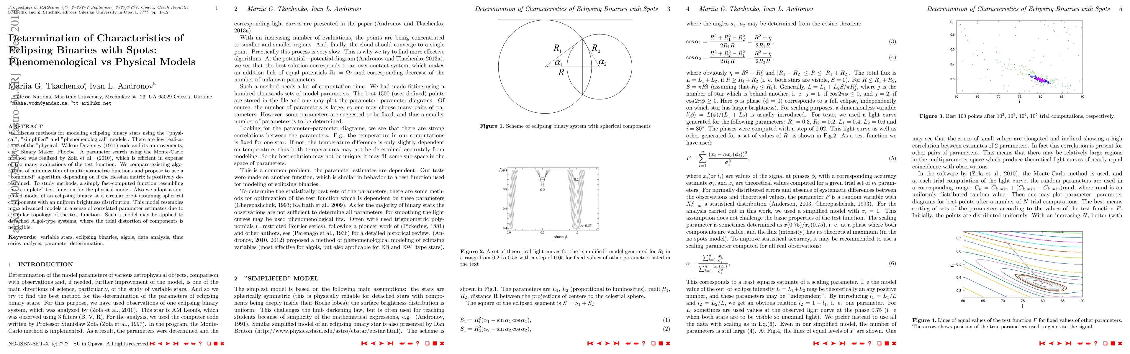 We discuss methods for modeling eclipsing binary stars using the "physical", "simplified" and "phenomenological" models. There are few realizations of the "physical" Wilson-Devinney (1971) code and its improvements, e.g. Binary Maker, Phoebe. A parameter search using the Monte-Carlo method was realized by Zola et al. (2010), which is efficient in expense of too many evaluations of the test function. We compare existing algorithms of minimization of multi-parametric functions and propose to use a "combined" algorithm, depending on if the Hessian matrix is positively determined. To study methods, a simply fast-computed function resembling the "complete" test function for the physical model. Also we adopt a simplified model of an eclipsing binary at a circular orbit assuming spherical components with an uniform brightness distribution. This model resembles more advanced models in a sense of correlated parameter estimates due to a similar topology of the test function. Such a model may be applied to detached Algol-type systems, where the tidal distortion of components is negligible.