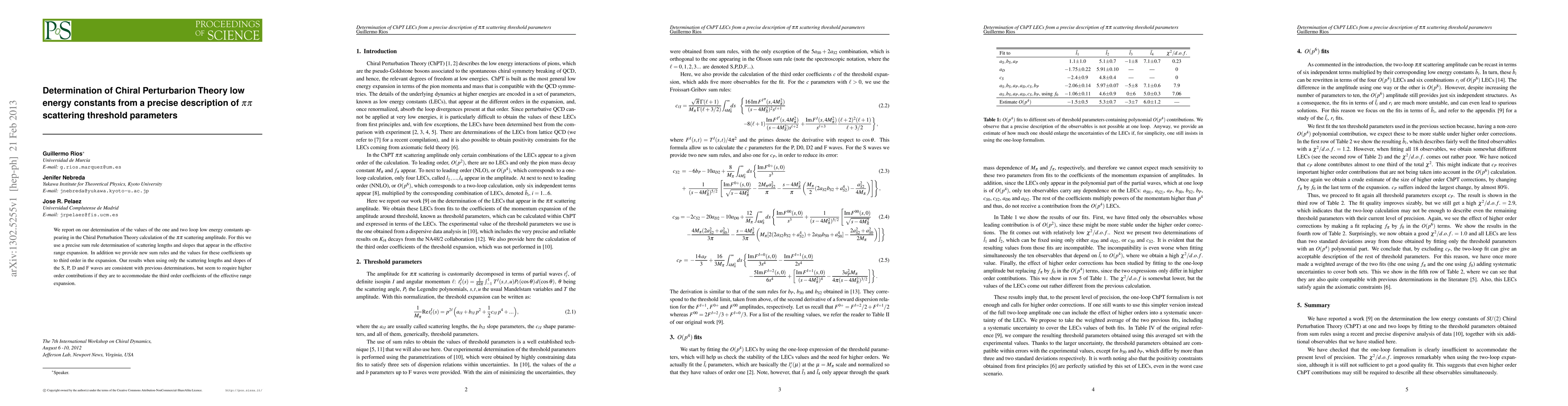 This paper determines Chiral Perturbation Theory low energy constants using precise pi-pi scattering threshold parameters, specifically the scattering lengths and slopes. The results align with previous findings but suggest the need for higher order contributions to accommodate third-order coefficients.