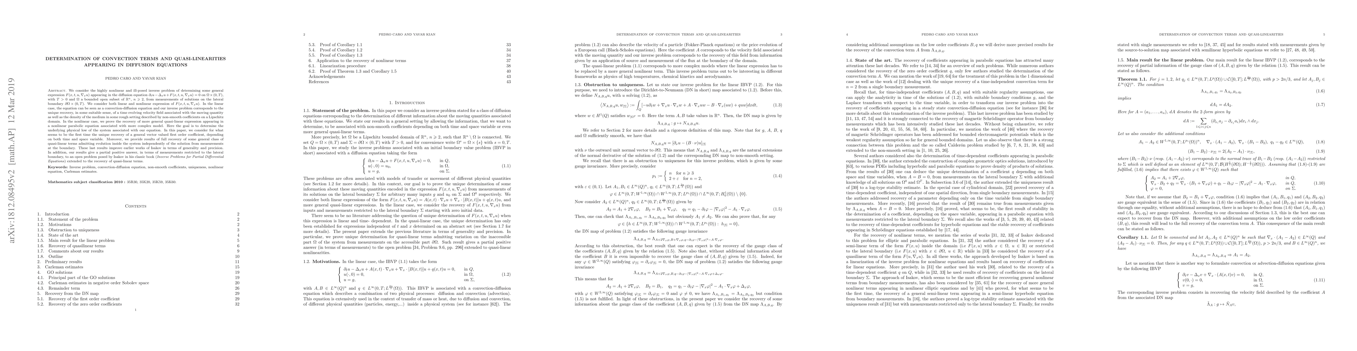 This paper addresses the inverse problem of determining the convection terms and quasi-linearities in diffusion equations from boundary measurements. It uniquely recovers a general vector-valued first-order coefficient and provides results for a class of quasi-linear terms, improving upon previous works and offering a partial solution to an open problem posed by Isakov.
