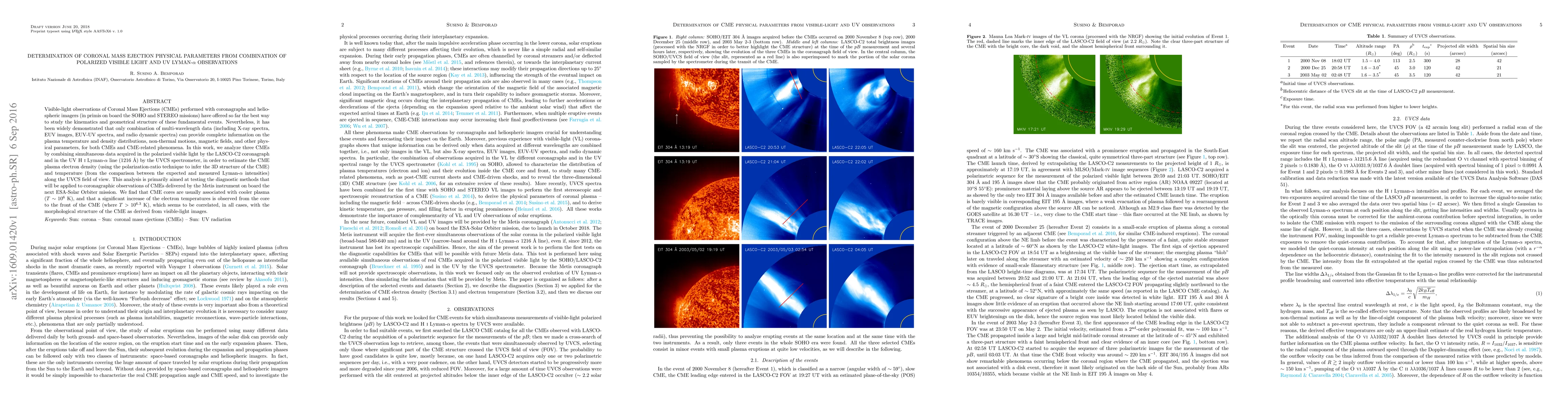 Visible-light observations of Coronal Mass Ejections (CMEs) performed with coronagraphs and heliospheric imagers (in primis on board the SOHO and STEREO missions) have offered so far the best way to study the kinematics and geometrical structure of these fundamental events. Nevertheless, it has been widely demonstrated that only combination of multi-wavelength data (including X-ray spectra, EUV images, EUV-UV spectra, and radio dynamic spectra) can provide complete information on the plasma temperature and density distributions, non-thermal motions, magnetic fields, and other physical parameters, for both CMEs and CME-related phenomena. In this work, we analyze three CMEs by combining simultaneous data acquired in the polarized visible light by the LASCO-C2 coronagraph and in the UV H I Lyman-$\alpha$ line (1216 \AA) by the UVCS spectrometer, in order to estimate the CME plasma electron density (using the polarization-ratio technique to infer the 3D structure of the CME) and temperature (from the comparison between the expected and measured Lyman-$\alpha$ intensities) along the UVCS field of view. This analysis is primarily aimed at testing the diagnostic methods that will be applied to coronagraphic observations of CMEs delivered by the Metis instrument on board the next ESA-Solar Orbiter mission. We find that CME cores are usually associated with cooler plasma ($T \sim 10^6$ K), and that a significant increase of the electron temperatures is observed from the core to the front of the CME (where $T > 10^{6.3}$ K), which seems to be correlated, in all cases, with the morphological structure of the CME as derived from visible-light images.