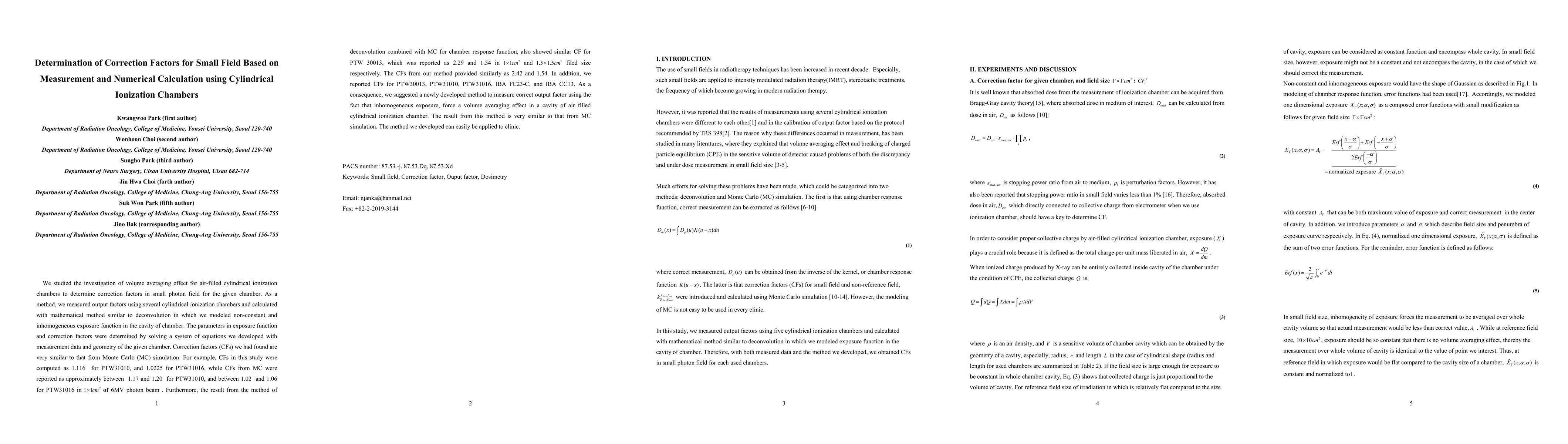 We studied the investigation of volume averaging effect for air-filled cylindrical ionization chambers to determine correction factors in small photon field for the given chamber. As a method, we measured output factors using several cylindrical ionization chambers and calculated with mathematical method similar to deconvolution in which we modeled non-constant and inhomogeneous exposure function in the cavity of chamber. The parameters in exposure function and correction factors were determined by solving a system of equations we developed with measurement data and geometry of the given chamber. Correction factors (CFs) we had found are very similar to that from Monte Carlo (MC) simulation. For example, CFs in this study were computed as 1.116 for PTW31010, and 1.0225 for PTW31016, while CFs from MC were reported as approximately between 1.17 and 1.20 for PTW31010, and between 1.02 and 1.06 for PTW31016 in of 6MV photon beam . Furthermore, the result from the method of deconvolution combined with MC for chamber response function, also showed similar CF for PTW 30013, which was reported as 2.29 and 1.54 in and filed size respectively. The CFs from our method provided similarly as 2.42 and 1.54. In addition, we reported CFs for PTW30013, PTW31010, PTW31016, IBA FC23-C, and IBA CC13. As a consequence, we suggested a newly developed method to measure correct output factor using the fact that inhomogeneous exposure, force a volume averaging effect in a cavity of air filled cylindrical ionization chamber. The result from this method is very similar to that from MC simulation. The method we developed can easily be applied to clinic.