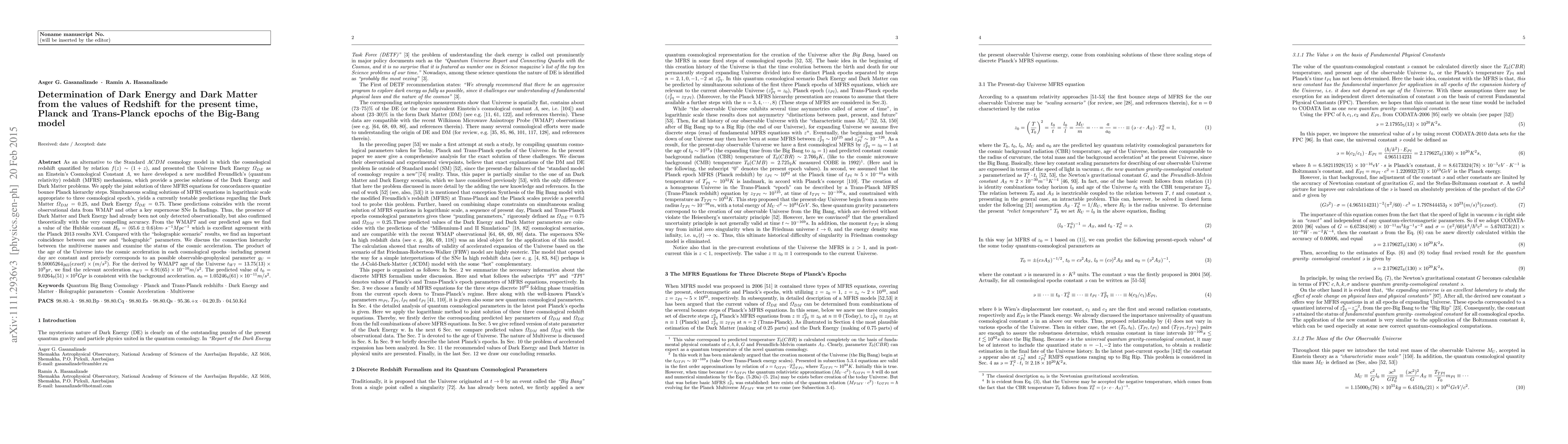 As an alternative to the Standard cosmology model we have developed a new modified Freundlich's (quantum relativity) redshift (MFRS) mechanisms, which provide a precise solutions of the Dark Energy and Dark Matter problems. We apply the joint solution of three MFRS equations for concordances quantize bounce Planck hierarchy steps. Simultaneous scaling solutions of MFRS equations in logarithmic scale appropriate to three cosmological epoch's, yields a currently testable predictions regarding the Dark Matter {\Omega}_{DM} = 0.25, and Dark Energy {\Omega}_{DE} = 0.75. These predictions coincides with the recent observational data from WMAP and other a key supernovae SNe Ia findings. Thus, the presence of Dark Matter and Dark Energy had already been not only detected observationally, but also confirmed theoretically with the very compelling accuracy. From the WMAP7 and our predicted ages we find a value of the Hubble constant H_0 = 65.6 km * s^{-1} Mpc^{-1} which is excellent agreement with the Planck 2013 results XVI. Compared with the "holographic scenario" results, we find an important coincidence between our new and "holographic" parameters. We discuss the connection hierarchy between the multiverse masses and examine the status of the cosmic acceleration. The product of the age of the Universe into the cosmic acceleration in each cosmological epochs --including present day are constant and precisely corresponds to an possible observable-geophysical parameter g_U = 9.50005264_{265} (exact) * (m/s^2). For the derived by WMAP7 age of the Universe t_{W7} = 13.75(13) * 10^9 yr, we find the relevant acceleration a_{W7} = 6.91(65) * 10^{-10} m/s^2. The predicted value of t_0 = 9.0264_9(51) * 10^2 Gyr is consistent with the background acceleration. a_0 = 1.05246_4(61) * 10^{-11} m/s^2.