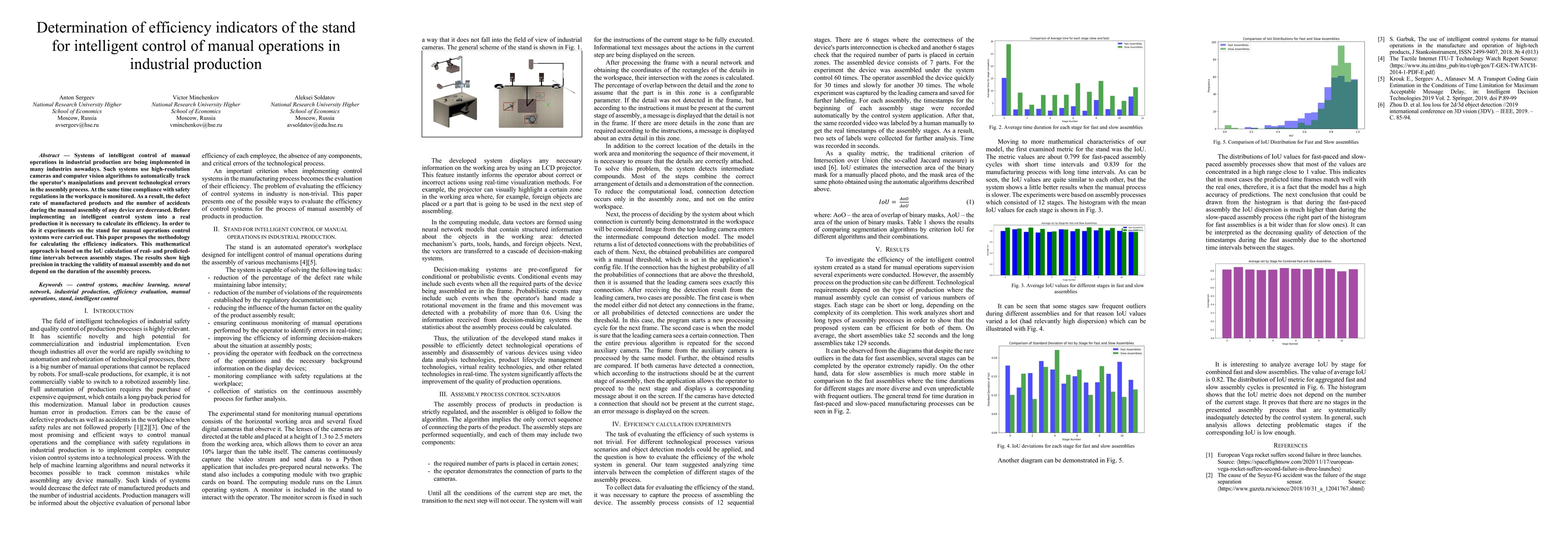 This paper proposes a methodology for calculating the efficiency indicators of an intelligent control system for manual operations in industrial production, using IoU to compare real and predicted time intervals between assembly stages. Experimental results demonstrate high precision in tracking manual assembly validity, independent of process duration.