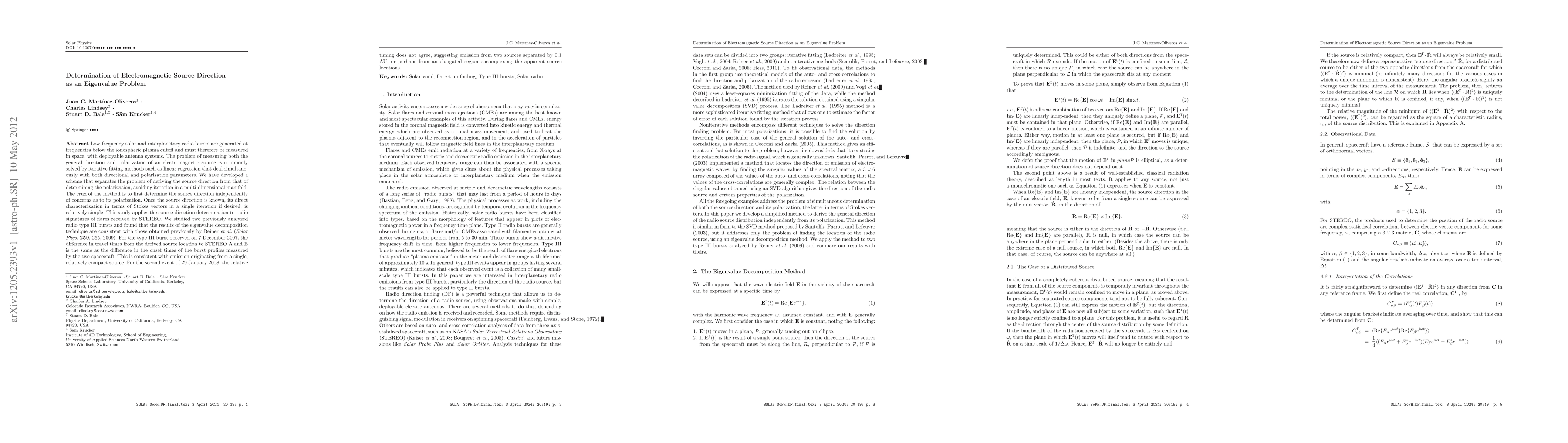 Low-frequency solar and interplanetary radio bursts are generated at frequencies below the ionospheric plasma cutoff and must therefore be measured in space, with deployable antenna systems. The problem of measuring both the general direction and polarization of an electromagnetic source is commonly solved by iterative fitting methods such as linear regression that deal simultaneously with both directional and polarization parameters. We have developed a scheme that separates the problem of deriving the source direction from that of determining the polarization, avoiding iteration in a multi-dimensional manifold. The crux of the method is to first determine the source direction independently of concerns as to its polarization. Once the source direction is known, its direct characterization in terms of Stokes vectors in a single iteration if desired, is relatively simple. This study applies the source-direction determination to radio signatures of flares received by STEREO. We studied two previously analyzed radio type III bursts and found that the results of the eigenvalue decomposition technique are consistent with those obtained previously by Reiner et al. (Solar Phys. 259, 255, 2009). For the type III burst observed on 7 December 2007, the difference in travel times from the derived source location to STEREO A and B is the same as the difference in the onset times of the burst profiles measured by the two spacecraft. This is consistent with emission originating from a single, relatively compact source. For the second event of 29 January 2008, the relative timing does not agree, suggesting emission from two sources separated by 0.1 AU, or perhaps from an elongated region encompassing the apparent source locations.
