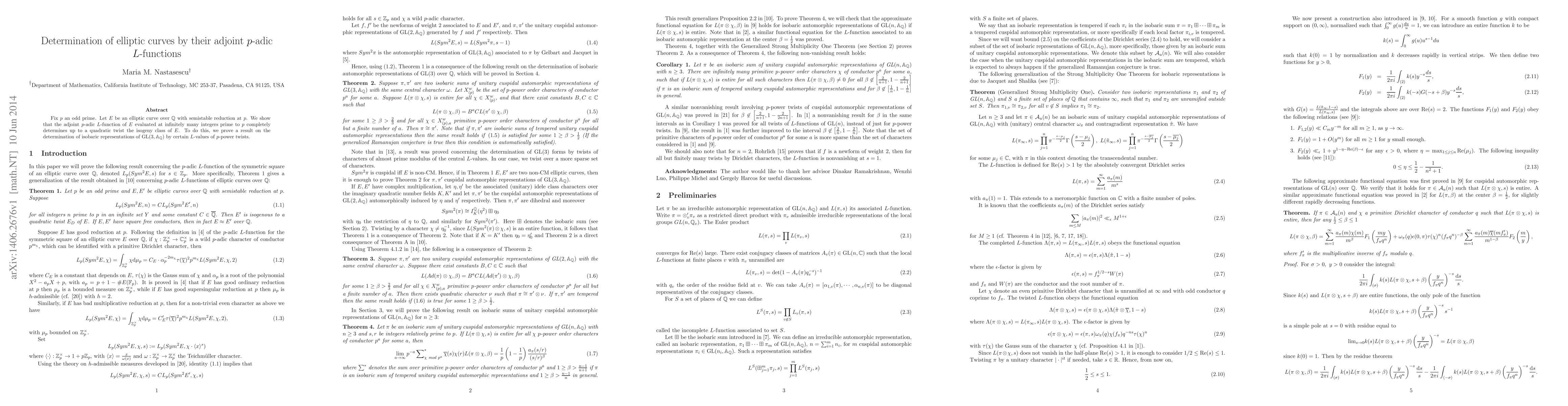 Fix $p$ an odd prime. Let $E$ be an elliptic curve over $\mathbb{Q}$ with semistable reduction at $p$. We show that the adjoint $p$-adic $L$-function of $E$ evaluated at infinitely many integers prime to $p$ completely determines up to a quadratic twist the isogeny class of $E$. To do this, we prove a result on the determination of isobaric representations of $\text{GL}(3, \mathbb{A}_\mathbb{Q})$ by certain $L$-values of $p$-power twists.