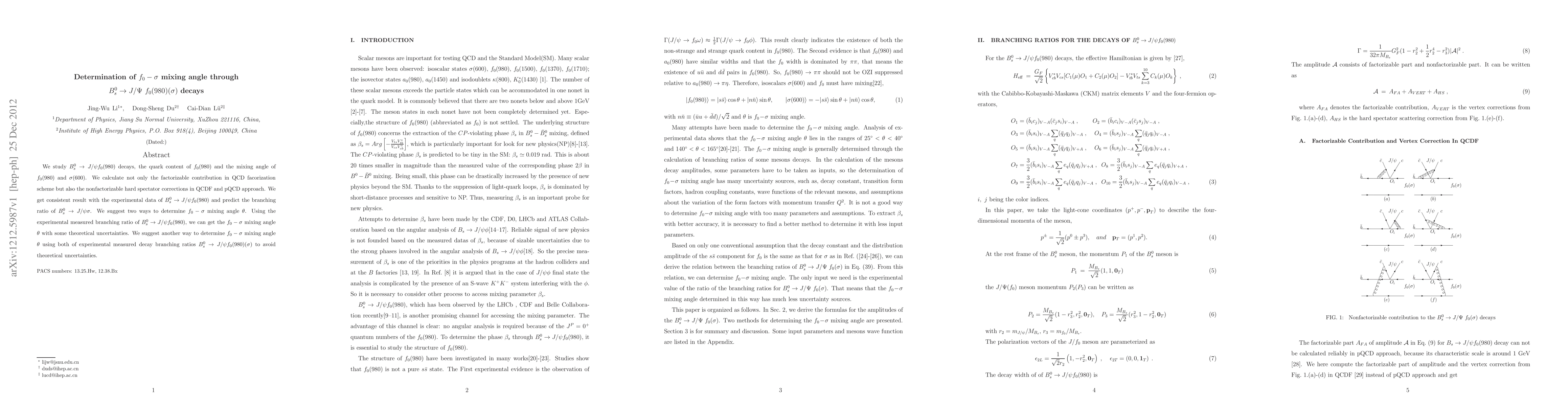 This paper investigates $B_s^0 \to J/\psi f_0(980)$ decays to determine the $f_0-\sigma$ mixing angle, calculating both factorizable and nonfactorizable corrections. It proposes two methods to determine the mixing angle, one using the experimental branching ratio and another using both $B_s^0 \to J/\psi f_0(980)$ and $B_s^0 \to J/\psi \sigma$ to minimize theoretical uncertainties.