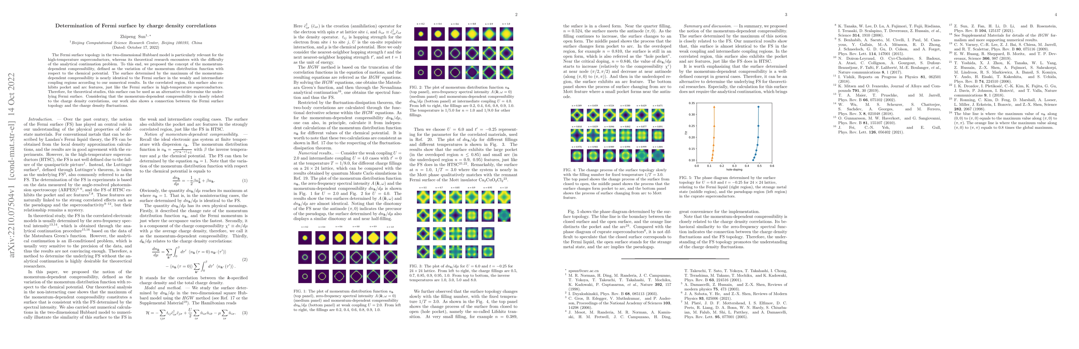 This paper proposes using momentum-dependent compressibility to determine the Fermi surface topology in the two-dimensional Hubbard model, finding it closely matches the Fermi surface in weakly and intermediately coupled regions. The method also reveals pocket and arc features in the correlated region, akin to high-temperature superconductors, linking Fermi surface topology to charge density correlations.