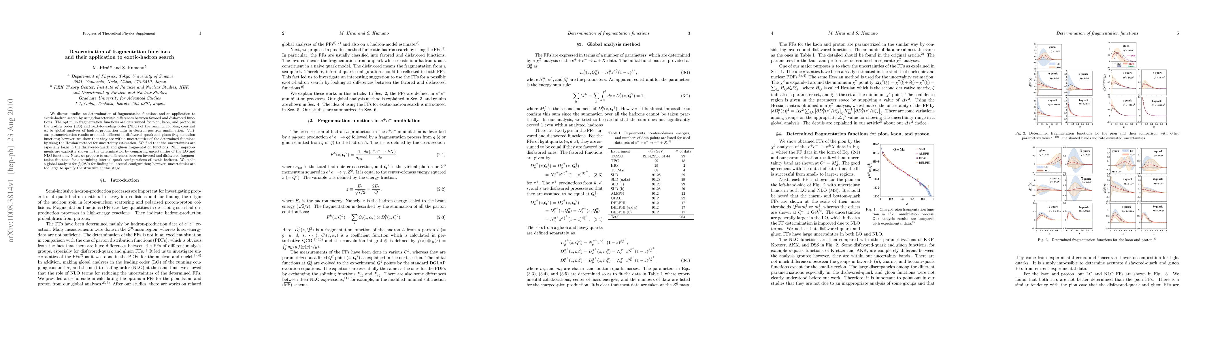 We discuss studies on determination of fragmentation functions and an application to exotic-hadron search by using characteristic differences between favored and disfavored functions. The optimum fragmentation functions are determined for pion, kaon, and proton in the leading order (LO) and next-to-leading order (NLO) of the running coupling constant alpha_s by global analyses of hadron-production data in electron-positron annihilation. Various parametrization results are much different in disfavored-quark and gluon fragmentation functions; however, we show that they are within uncertainties of the determined functions by using the Hessian method for uncertainty estimation. We find that the uncertainties are especially large in the disfavored-quark and gluon fragmentation functions. NLO improvements are explicitly shown in the determination by comparing uncertainties of the LO and NLO functions. Next, we propose to use differences between favored and disfavored fragmentation functions for determining internal quark configurations of exotic hadrons. We make a global analysis for f_0 (980) for finding its internal configuration; however, uncertainties are too large to specify the structure at this stage.