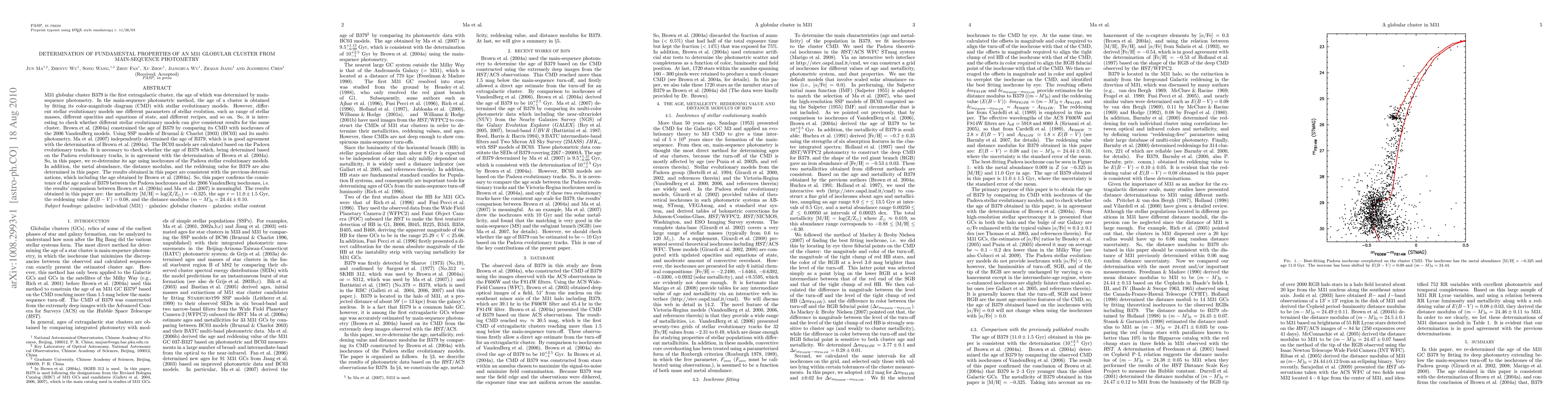 M31 globular cluster B379 is the first extragalactic cluster, the age of which was determined by main-sequence photometry. In this method, the age of a cluster is obtained by fitting its CMD with stellar evolutionary models. However, different stellar evolutionary models use different parameters of stellar evolution, such as range of stellar masses, different opacities and equations of state, and different recipes, and so on. So, it is interesting to check whether different stellar evolutionary models can give consistent results for the same cluster. Brown et al. (2004a) constrained the age of B379 by comparing its CMD with isochrones of the 2006 VandenBerg models. Using SSP models of BC03 and its multi-photometry, Ma et al. (2007) independently determined the age of B379, which is in good agreement with the determination of Brown et al. (2004a). The BC03 models are calculated based on the Padova evolutionary tracks. It is necessary to check whether the age of B379 which, being determined based on the Padova evolutionary tracks, is in agreement with the determination of Brown et al. (2004a). So, in this paper, we re-determine its age using isochrones of the Padova stellar evolutionary models. In addition, the metal abundance, the distance modulus, and the reddening value for B379 are also determined in this paper. The results obtained in this paper are consistent with the previous determinations, which including the age obtained by Brown et al. (2004a). So, this paper confirms the consistence of the age scale of B379 between the Padova isochrones and the 2006 VandenBerg isochrones, i.e. the results' comparison between Brown et al. (2004a) and Ma et al. (2007) is meaningful. The results obtained in this paper are: the metallicity [M/H]=-0.325, the age $\tau=11.0\pm1.5$ Gyr, the reddening value E(B-V)=0.08, and the distance modulus $(m-M)_{0}=24.44\pm0.10$.