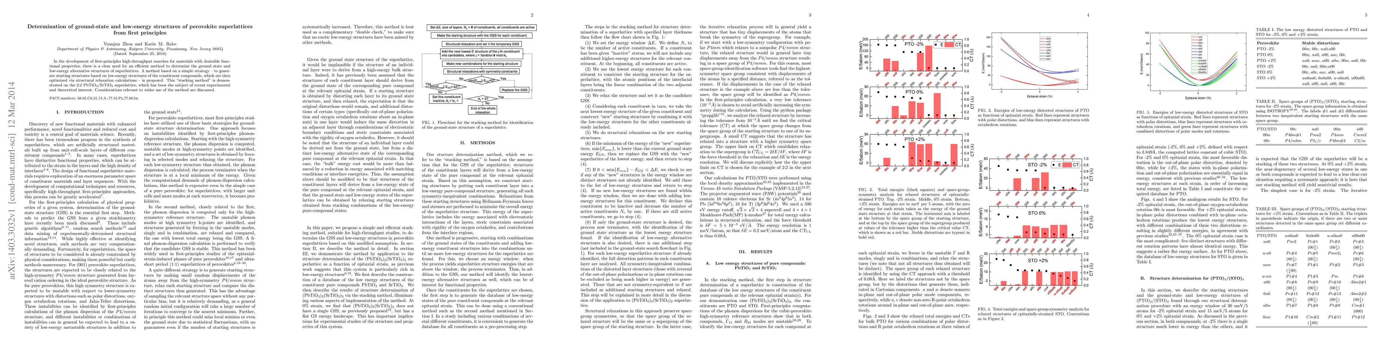 This research introduces a 'stacking method' for determining the ground state and low-energy structures of perovskite superlattices using first-principles calculations. The method, demonstrated on PbTiO3/SrTiO3 superlattice, generates starting structures from constituent compound low-energy structures, optimizing via relaxation calculations, aiding high-throughput material discovery.