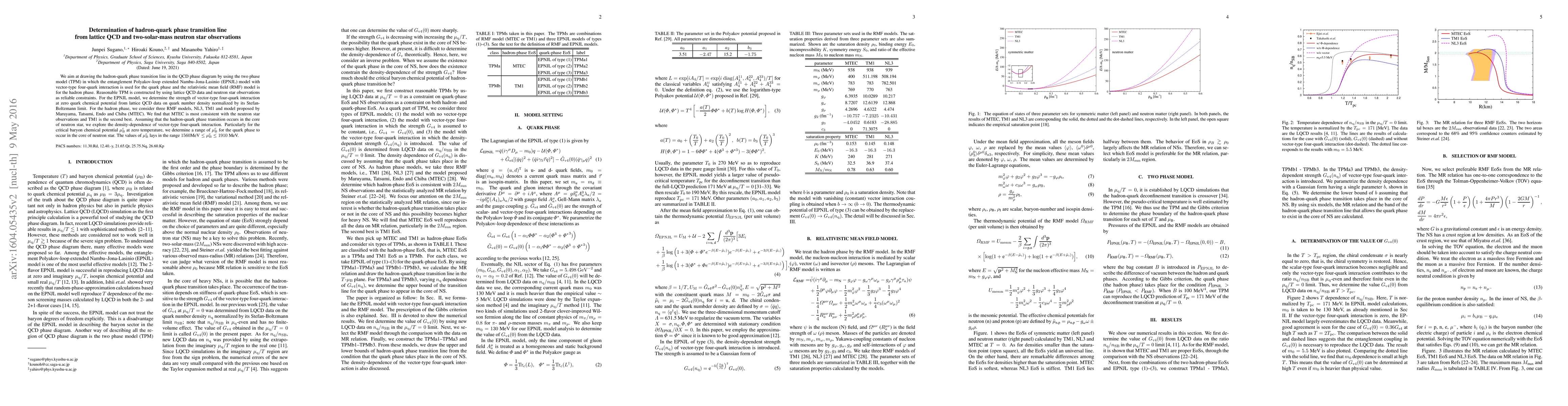 This research determines the hadron-quark phase transition line using lattice QCD data and neutron star observations, employing the entanglement Polyakov-loop extended Nambu--Jona-Lasinio model for the quark phase and the relativistic mean field model for the hadron phase. The study finds that the MTEC model best fits neutron star observations, determining a range for the critical baryon chemical potential for quark phase occurrence in neutron star cores.
