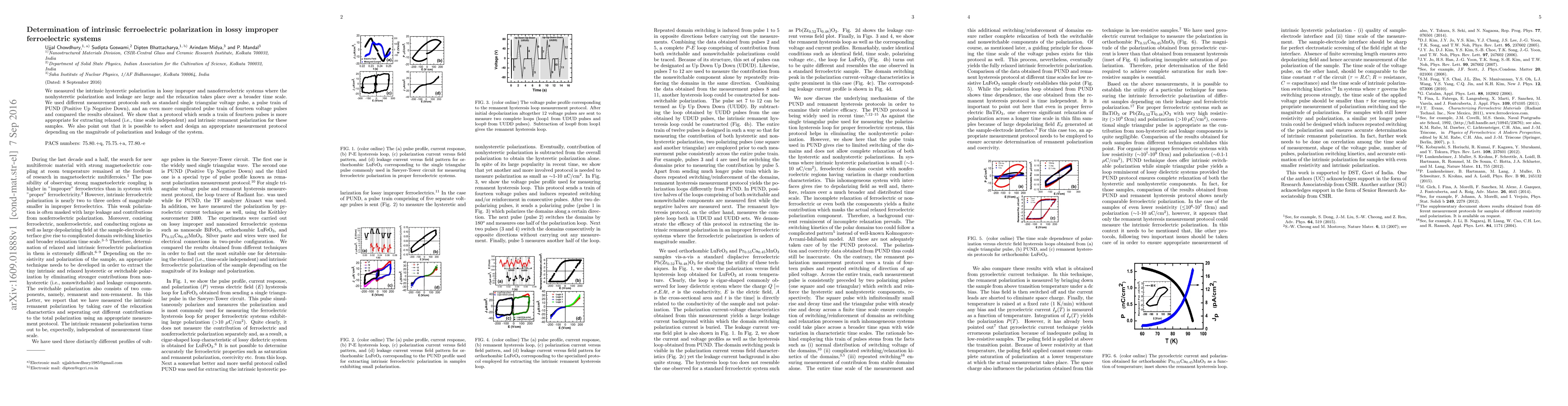 We measured the intrinsic hysteretic polarization in lossy improper and nanoferroelectric systems where the nonhysteretic polarization and leakage are large and the relaxation takes place over a broader time scale. We used different measurement protocols such as standard single triangular voltage pulse, a pulse train of PUND (Positive Up Negative Down), and an even more complicated pulse train of fourteen voltage pulses and compared the results obtained. We show that a protocol which sends a train of fourteen pulses is more appropriate for extracting relaxed (i.e., time scale independent) and intrinsic remanent polarization for these samples. We also point out that it is possible to select and design an appropriate measurement protocol depending on the magnitude of polarization and leakage of the system.