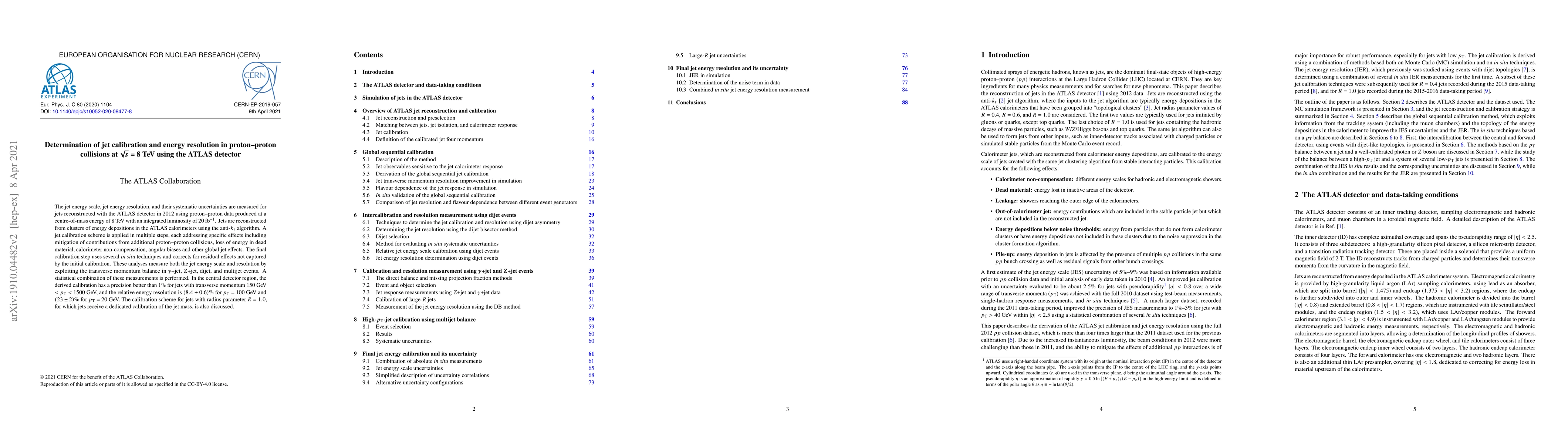Researchers at ATLAS measured jet energy scale and resolution in proton-proton collisions at 8 TeV using 20 fb$^{-1}$ of data, achieving precision better than 1% for jets with transverse momentum between 150 GeV and 1500 GeV.