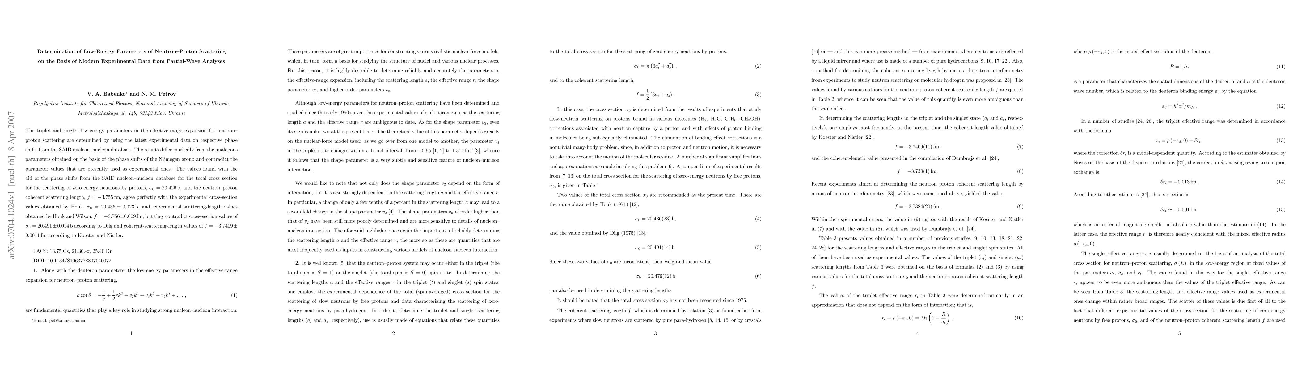 The triplet and singlet low-energy parameters in the effective-range expansion for neutron--proton scattering are determined by using the latest experimental data on respective phase shifts from the SAID nucleon--nucleon database. The results differ markedly from the analogous parameters obtained on the basis of the phase shifts of the Nijmegen group and contradict the parameter values that are presently used as experimental ones. The values found with the aid of the phase shifts from the SAID nucleon--nucleon database for the total cross section for the scattering of zero-energy neutrons by protons, $\sigma_{0}=20.426 $b, and the neutron--proton coherent scattering length, $f=-3.755 $fm, agree perfectly with the experimental cross-section values obtained by Houk, $\sigma_{0}=20.436\pm 0.023 $b, and experimental scattering-length values obtained by Houk and Wilson, $f=-3.756\pm 0.009 $fm, but they contradict cross-section values of $\sigma_{0}=20.491\pm 0.014 $b according to Dilg and coherent-scattering-length values of $f=-3.7409\pm 0.0011 $fm according to Koester and Nistler.