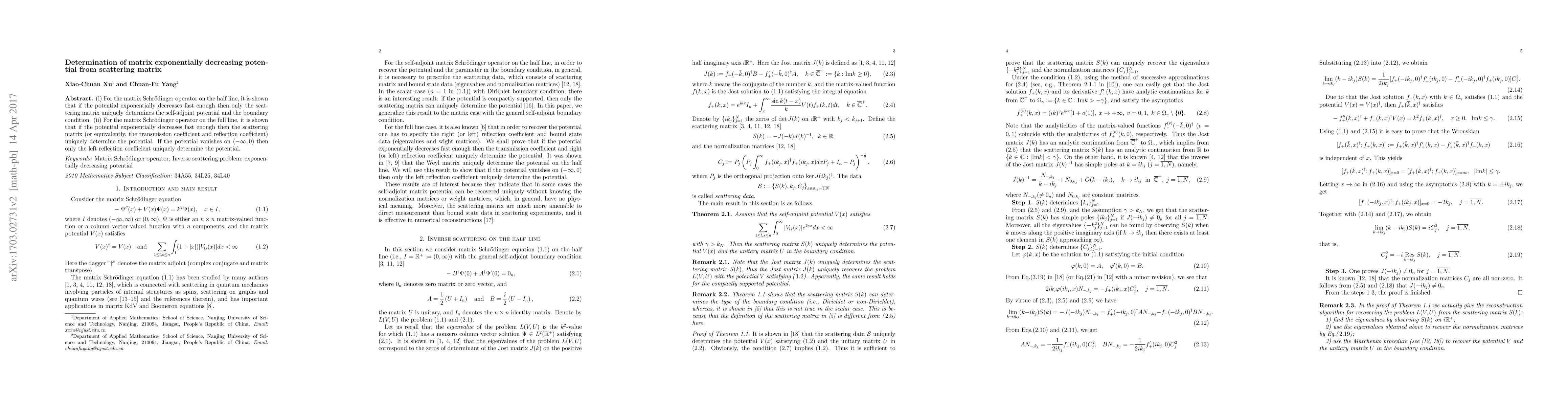 (i) For the matrix Schr\"{o}dinger operator on the half line, it is shown that if the potential exponentially decreases fast enough then only the scattering matrix uniquely determines the self-adjoint potential and the boundary condition. (ii) For the matrix Schr\"{o}dinger operator on the full line, it is shown that if the potential exponentially decreases fast enough then the scattering matrix (or equivalently, the transmission coefficient and reflection coefficient) uniquely determine the potential. If the potential vanishes on $(-\infty,0)$ then only the left reflection coefficient uniquely determine the potential.