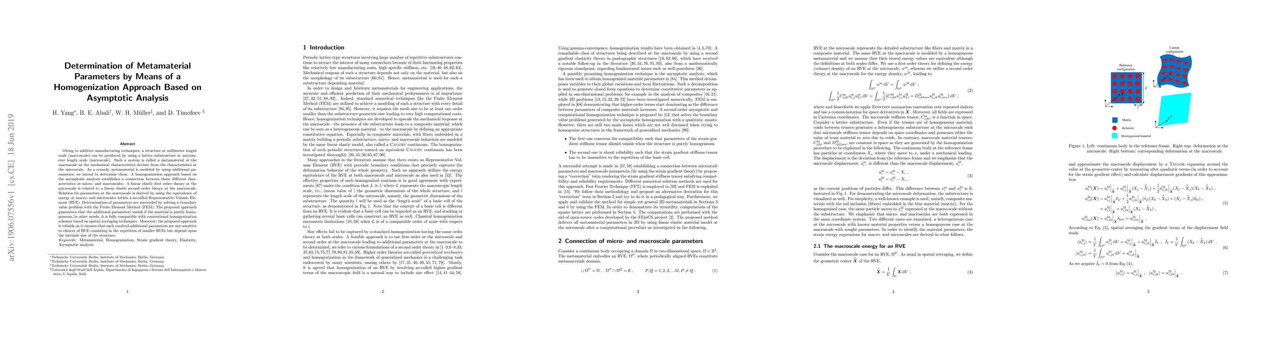 Owing to additive manufacturing techniques, a structure at millimeter length scale (macroscale) can be produced by using a lattice substructure at micrometer length scale (microscale). Such a system is called a metamaterial at the macroscale as the mechanical characteristics deviate from the characteristics at the microscale. As a remedy, metamaterial is modeled by using additional parameters; we intend to determine them. A homogenization approach based on the asymptotic analysis establishes a connection between these different characteristics at micro- and macroscales. A linear elastic first order theory at the microscale is related to a linear elastic second order theory at the macroscale. Relation for parameters at the macroscale is derived by using the equivalence of energy at macro- and microscales within a so-called Representative Volume Element (RVE). Determination of parameters are succeeded by solving a boundary value problem with the Finite Element Method (FEM). The proposed approach guarantees that the additional parameters vanish if the material is purely homogeneous, in other words, it is fully compatible with conventional homogenization schemes based on spatial averaging techniques. Moreover, the proposed approach is reliable as it ensures that such resolved additional parameters are not sensitive to choices of RVE consisting in the repetition of smaller RVEs but depend upon the intrinsic size of the structure.