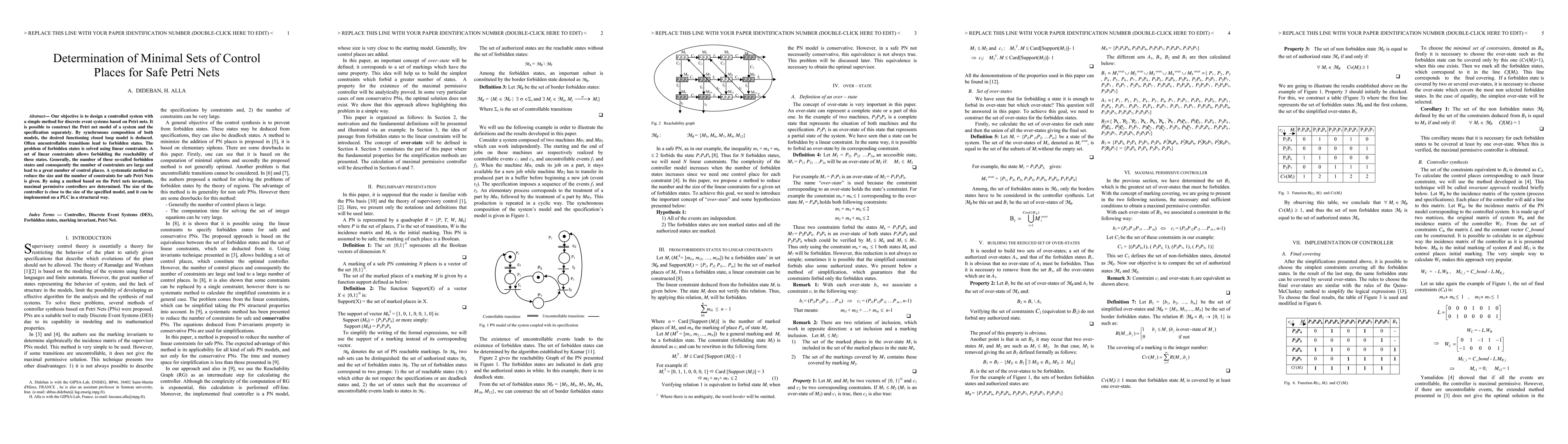 This paper proposes a method to determine minimal sets of control places for safe Petri Nets, aiming to reduce the complexity of controllers for discrete event systems. It uses linear constraints to prevent forbidden states and employs Petri net invariants to identify maximal permissive controllers, resulting in a controller size close to the original model.