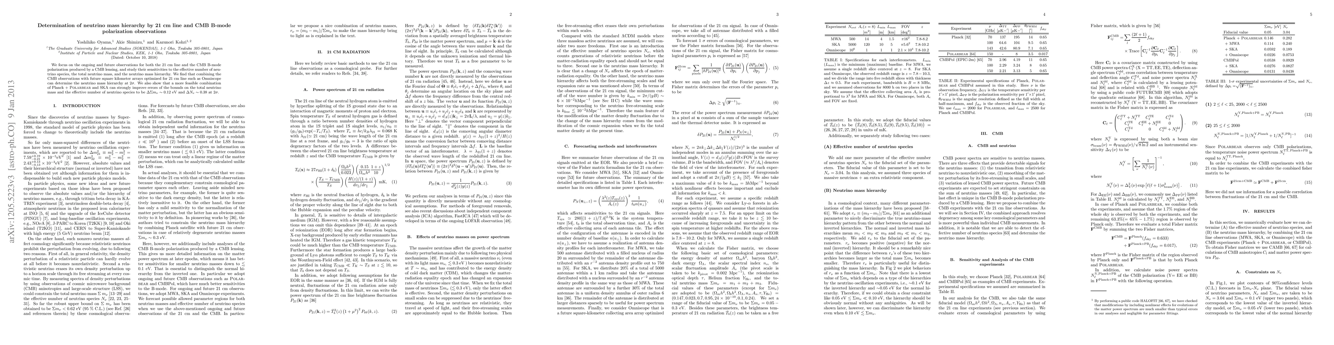 This paper investigates the combined use of 21 cm line and CMB B-mode polarization observations to determine the neutrino mass hierarchy and improve constraints on neutrino mass and species. It concludes that integrating future SKA arrays with CMB data can achieve a 2 sigma determination of the neutrino mass hierarchy and significantly reduce uncertainties on total neutrino mass and effective species number.