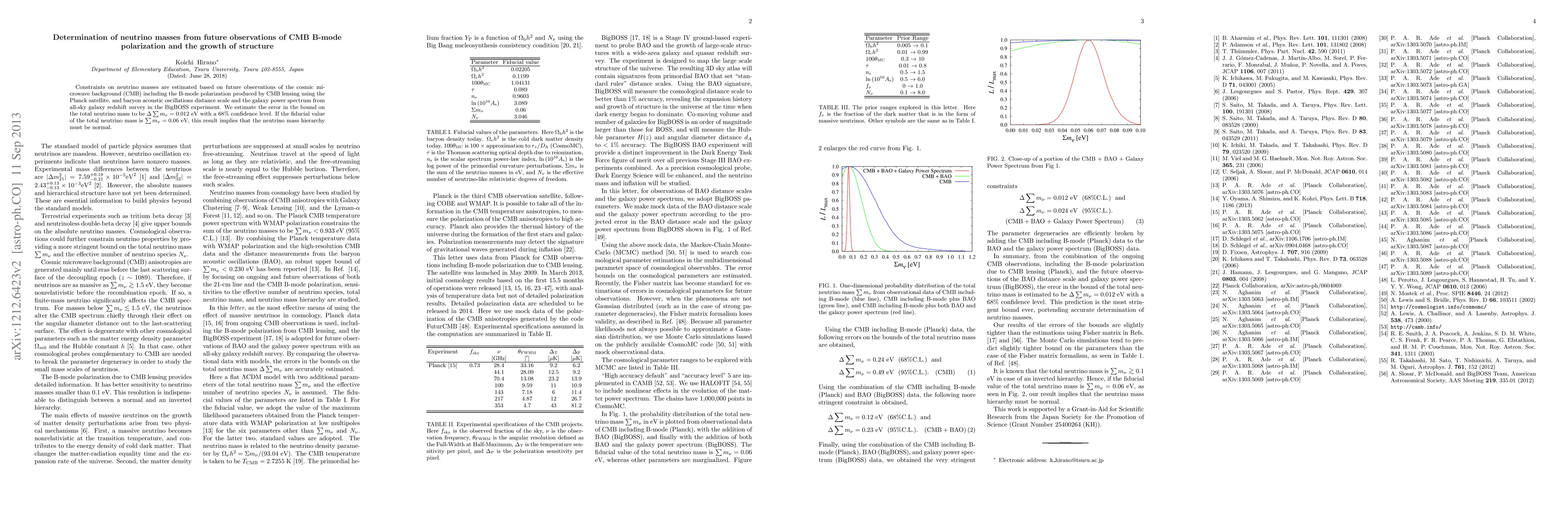This paper estimates constraints on neutrino masses from future CMB B-mode polarization and galaxy redshift survey data, predicting a total neutrino mass error of $\Delta\sum m_{\nu} = 0.012$ eV, implying a normal neutrino mass hierarchy if the fiducial value is $\sum m_{\nu}= 0.06$ eV.