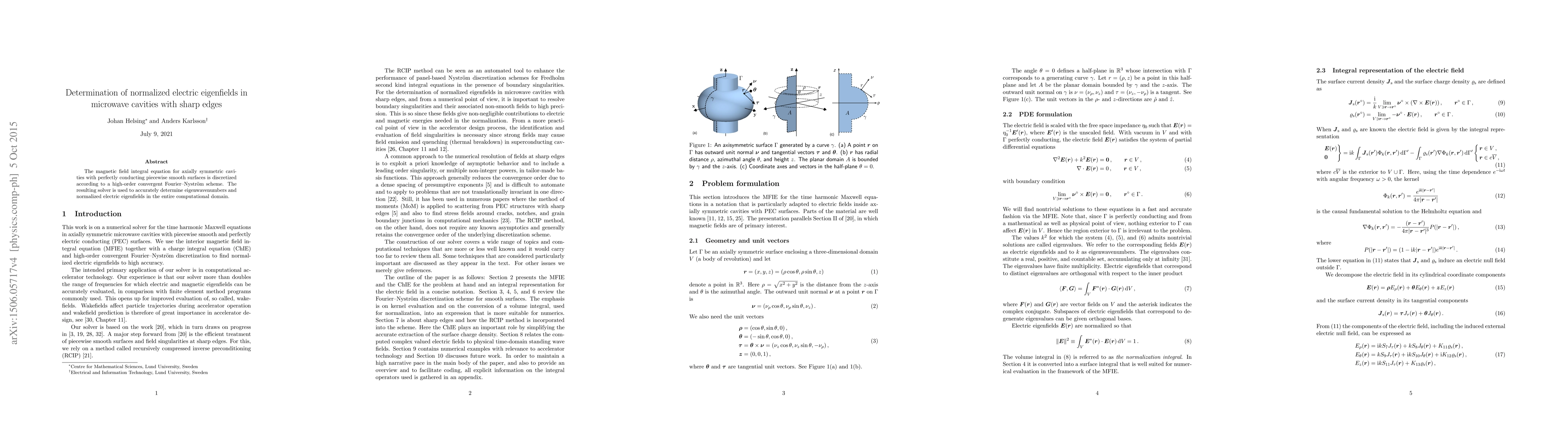 The magnetic field integral equation for axially symmetric cavities with perfectly conducting piecewise smooth surfaces is discretized according to a high-order convergent Fourier--Nystr\"om scheme. The resulting solver is used to accurately determine eigenwavenumbers and normalized electric eigenfields in the entire computational domain.