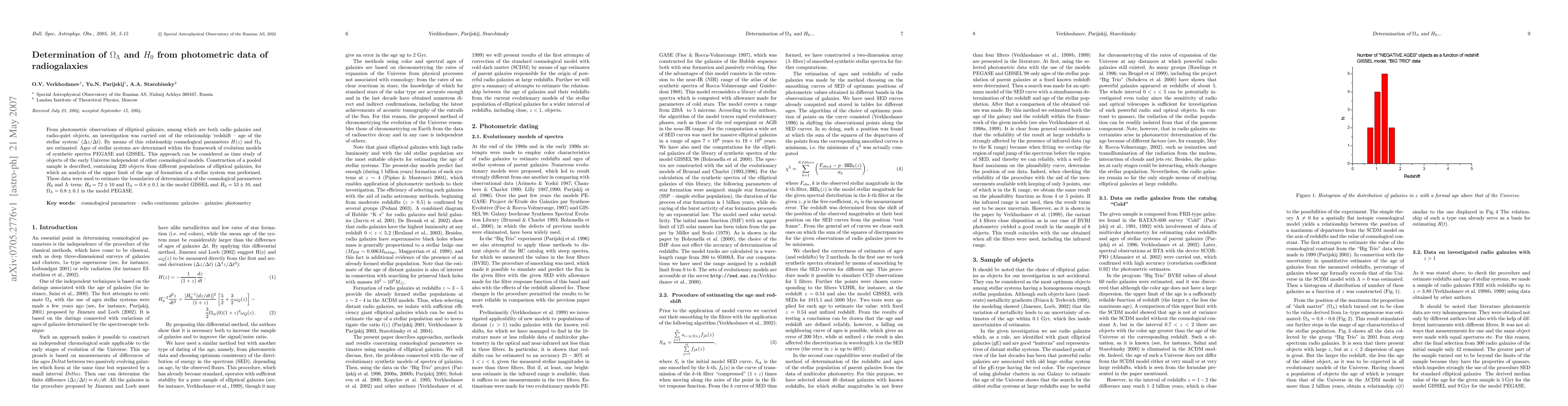 This paper estimates the cosmological parameters $H_0$ and $\Omega_\Lambda$ using photometric data from elliptical galaxies, including radio galaxies, to determine the relationship between redshift and stellar system age. The study yields $H_0=72\pm10$ and $\Omega_\Lambda=0.8\pm0.1$ in the GISSEL model, and $H_0=53\pm10$, $\Omega_\Lambda=0.8\pm0.1$ in the PEGASE model.