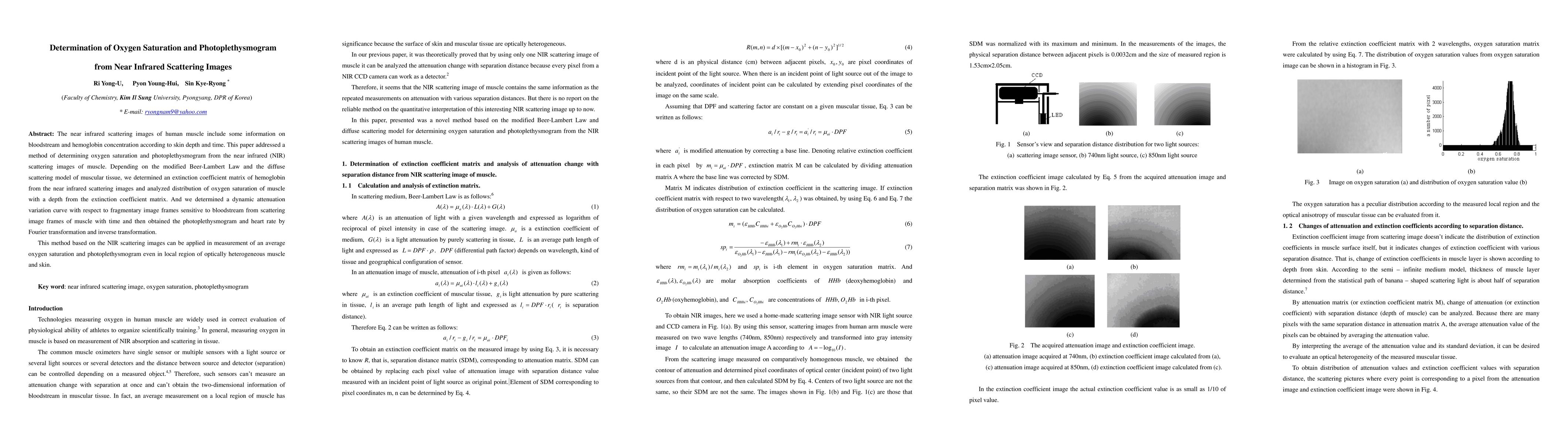 The near infrared scattering images of human muscle include some information on bloodstream and hemoglobin concentration according to skin depth and time. This paper addressed a method of determining oxygen saturation and photoplethysmogram from the near infrared (NIR) scattering images of muscle. Depending on the modified Beer-Lambert Law and the diffuse scattering model of muscular tissue, we determined an extinction coefficient matrix of hemoglobin from the near infrared scattering images and analyzed distribution of oxygen saturation of muscle with a depth from the extinction coefficient matrix. And we determined a dynamic attenuation variation curve with respect to fragmentary image frames sensitive to bloodstream from scattering image frames of muscle with time and then obtained the photoplethysmogram and heart rate by Fourier transformation and inverse transformation. This method based on the NIR scattering images can be applied in measurement of an average oxygen saturation and photoplethysmogram even in local region of optically heterogeneous muscle and skin.