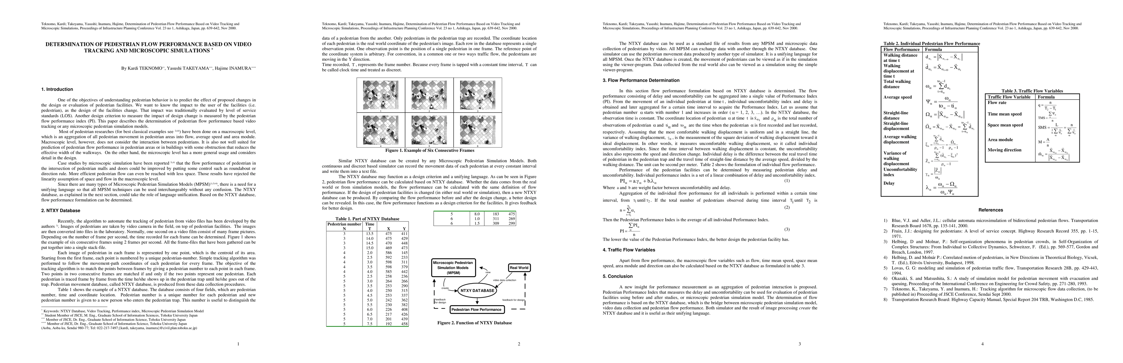 One of the objectives of understanding pedestrian behavior is to predict the effect of proposed changes in the design or evaluation of pedestrian facilities. We want to know the impact to the user of the facilities, as the design of the facilities change. That impact was traditionally evaluated by level of service standards. Another design criterion to measure the impact of design change is measured by the pedestrian flow performance index. This paper describes the determination of pedestrian flow performance based video tracking or any microscopic pedestrian simulation models. Most of pedestrian researches have been done on a macroscopic level, which is an aggregation of all pedestrian movement in pedestrian areas into flow, average speed and area module. Macroscopic level, however, does not consider the interaction between pedestrians. It is also not well suited for prediction of pedestrian flow performance in pedestrian areas or in buildings with some obstruction, that reduces the effective width of the walkways. On the other hand, the microscopic level has a more general usage and considers detail in the design. More efficient pedestrian flow can even be reached with less space. Those results have rejected the linearity assumption of space and flow in the macroscopic level.