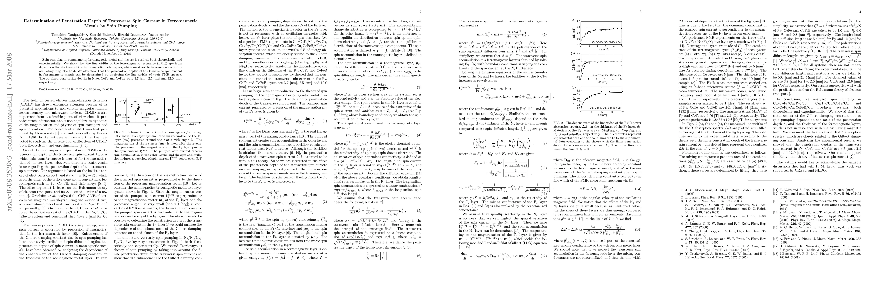 This paper investigates spin pumping in nonmagnetic/ferromagnetic multilayers, demonstrating that the linewidths of ferromagnetic resonance spectra correlate with the transverse spin current penetration depth in ferromagnetic metals. The study reveals penetration depths of 3.7 nm in NiFe, 2.5 nm in CoFe, and 12.0 nm in CoFeB.