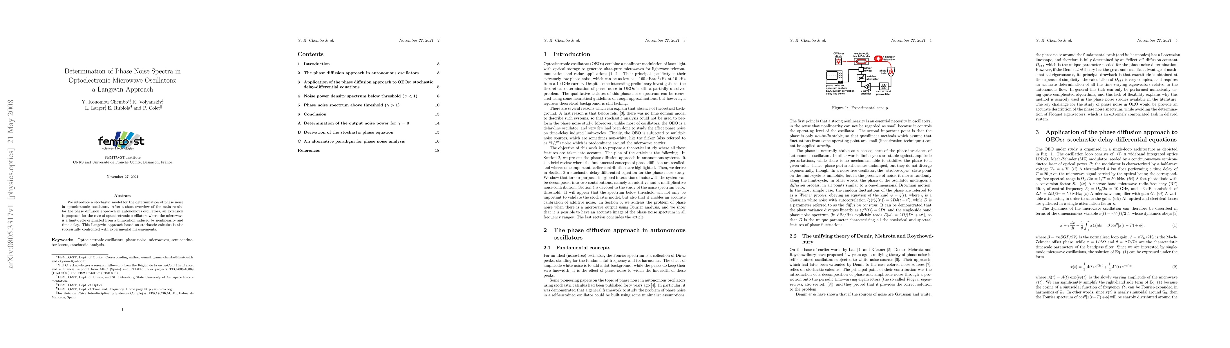 We introduce a stochastic model for the determination of phase noise in optoelectronic oscillators. After a short overview of the main results for the phase diffusion approach in autonomous oscillators, an extension is proposed for the case of optoelectronic oscillators where the microwave is a limit-cycle originated from a bifurcation induced by nonlinearity and time-delay. This Langevin approach based on stochastic calculus is also successfully confronted with experimental measurements.