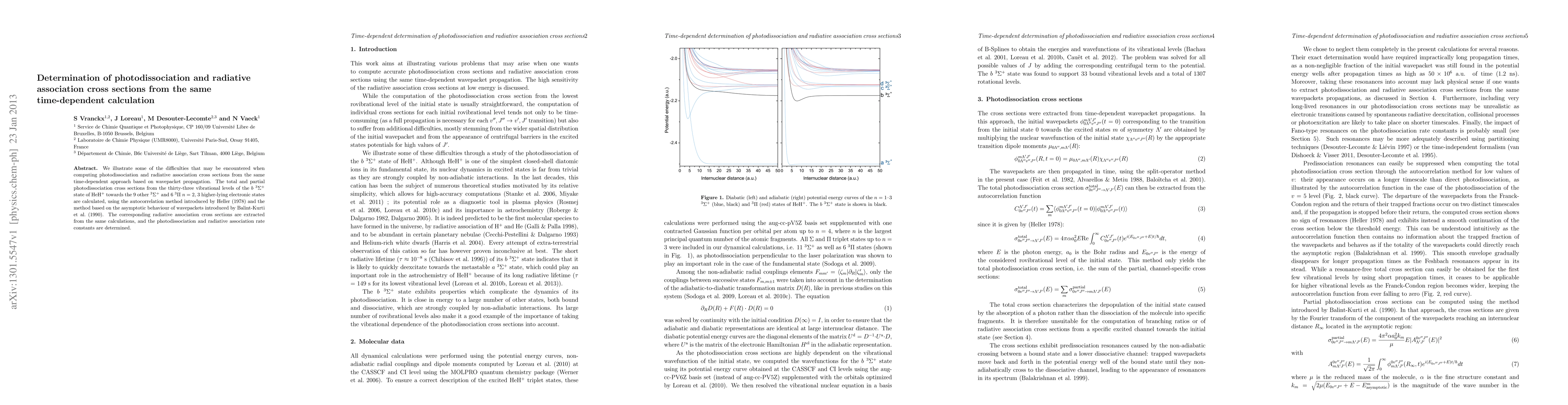 We illustrate some of the difficulties that may be encountered when computing photodissociation and radiative association cross sections from the same time-dependent approach based on wavepacket propagation. The total and partial photodissociation cross sections from the thirty-three vibrational levels of the b triplet {\Sigma}+ state of HeH+ towards the 9 other triplet {\Sigma}+ and 6 triplet {\Pi} n = 2, 3 higher-lying electronic states are calculated. The corresponding radiative association cross sections are extracted from the same calculations, and the photodissociation and radiative association rate constants are determined.