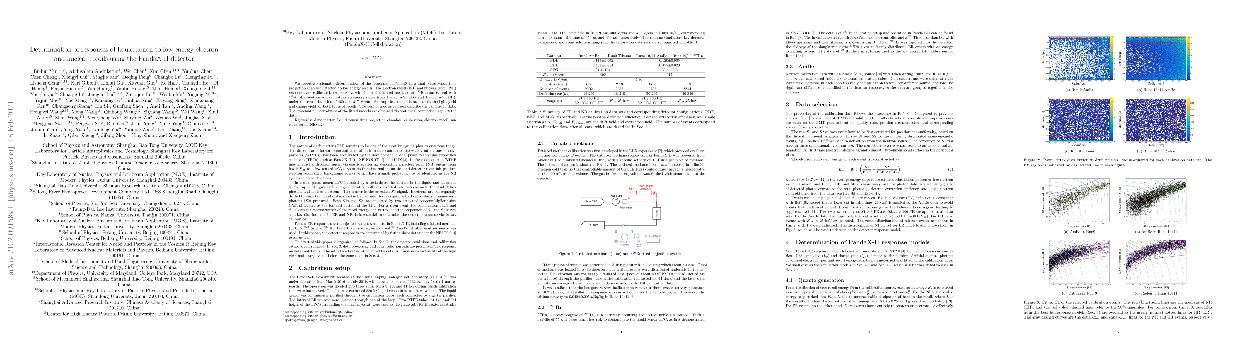 This paper details the calibration of the PandaX-II detector's responses to low-energy electron and nuclear recoils using tritiated methane and neutron sources, respectively. The study provides empirical models for light and charge yields, which accurately describe the detector's calibration data within specified energy ranges.