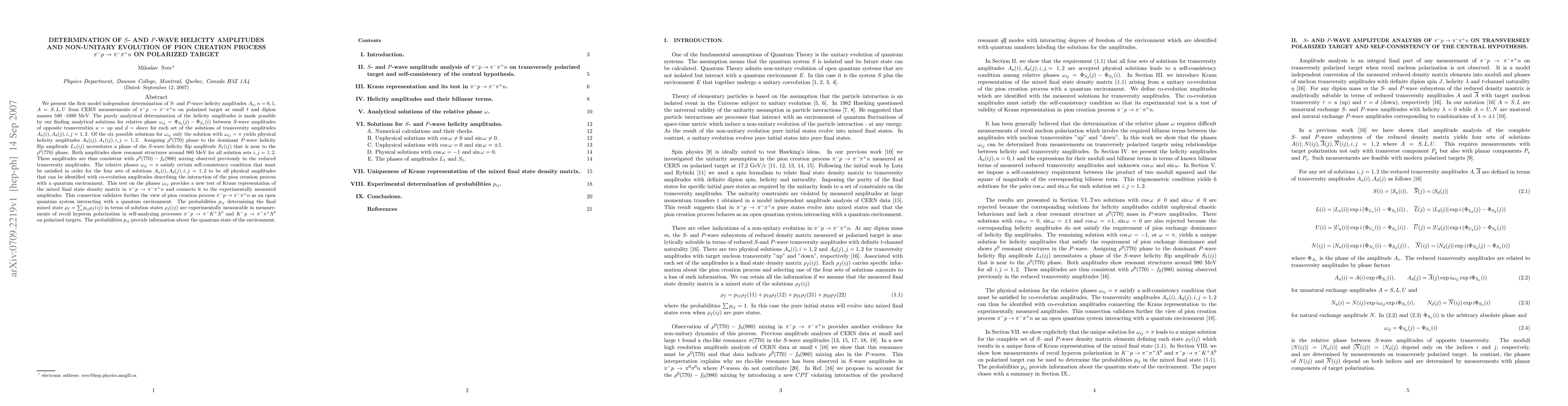 We present the first model independent determination of S- and P-wave helicity amplitudes from CERN measurements of pi(-)p -> pi(-)pi(+)n on polarized target at small t and dipion masses 580-1080 MeV. The purely analytical determination of the helicity amplitudes is made possible by our finding analytical solution for relative phase omega_ij between S-wave amplitudes S_d and S_u of opposite transversity for each set of solutions for transversity amplitudes A_u(i), A_d(j),i,j=1,2. Of the six possible solutions for omega_ij only the solution with omega_ij=pi yields physical helicity amplitudes. Assigning rho^0(770) phase to the dominant P-wave helicity flip amplitude L_1(ij) necessitates a phase of the S-wave helicity flip amplitude S_1(ij) that is near to the rho^0(770) phase.These two amplitudes are consistent with rho^0(770)-f_0(980) mixing. The relative phases omega_ij=pi satisfy certain selfconsistency relation that must be satisfied in order for the four sets of solutions A_u(i),A_d(j),i,j=1,2 to be all physical solutions that can be identified with coevolution amplitudes describing the interaction of the pion creation process with a quantum environment. This test on phases omega_ij provides a new test of Kraus representation of the mixed final state density matrix. We show that the probabilities p_ij determining the final state rho_f in terms of solution states rho_f(ij) can be determined in measurements of recoil hyperon polarization in pi(-)p->pi(-)K(+)Lambda0 on polarized target.
