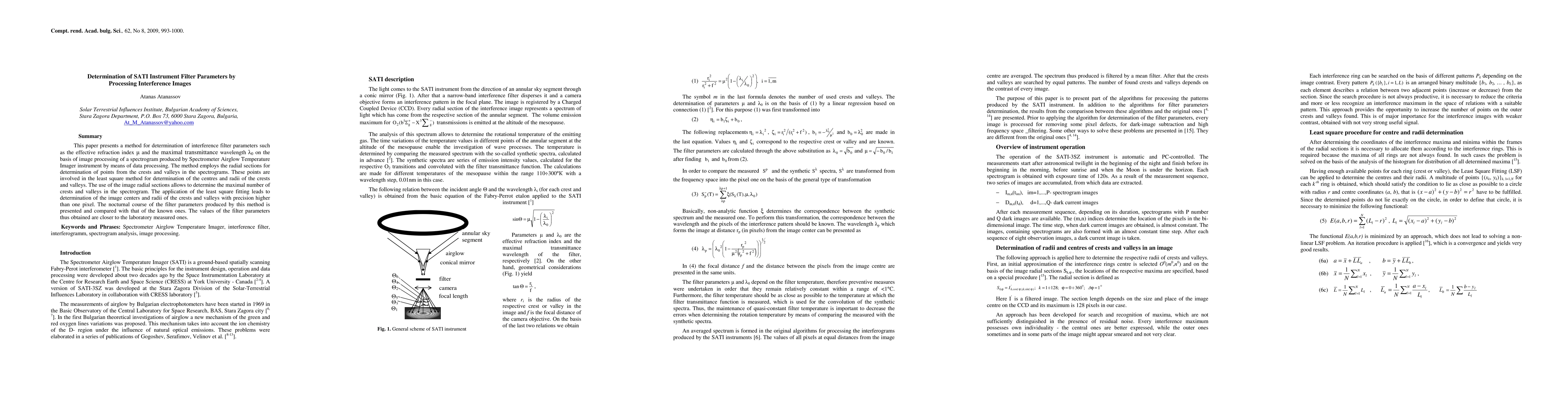 This paper proposes a method for determining interference filter parameters of the Spectrometer Airglow Temperature Imager (SATI) using image processing of spectrograms, achieving precise determination of effective refraction index and maximal transmittance wavelength through radial sections and least square fitting. The results are closer to laboratory measurements compared to known methods.