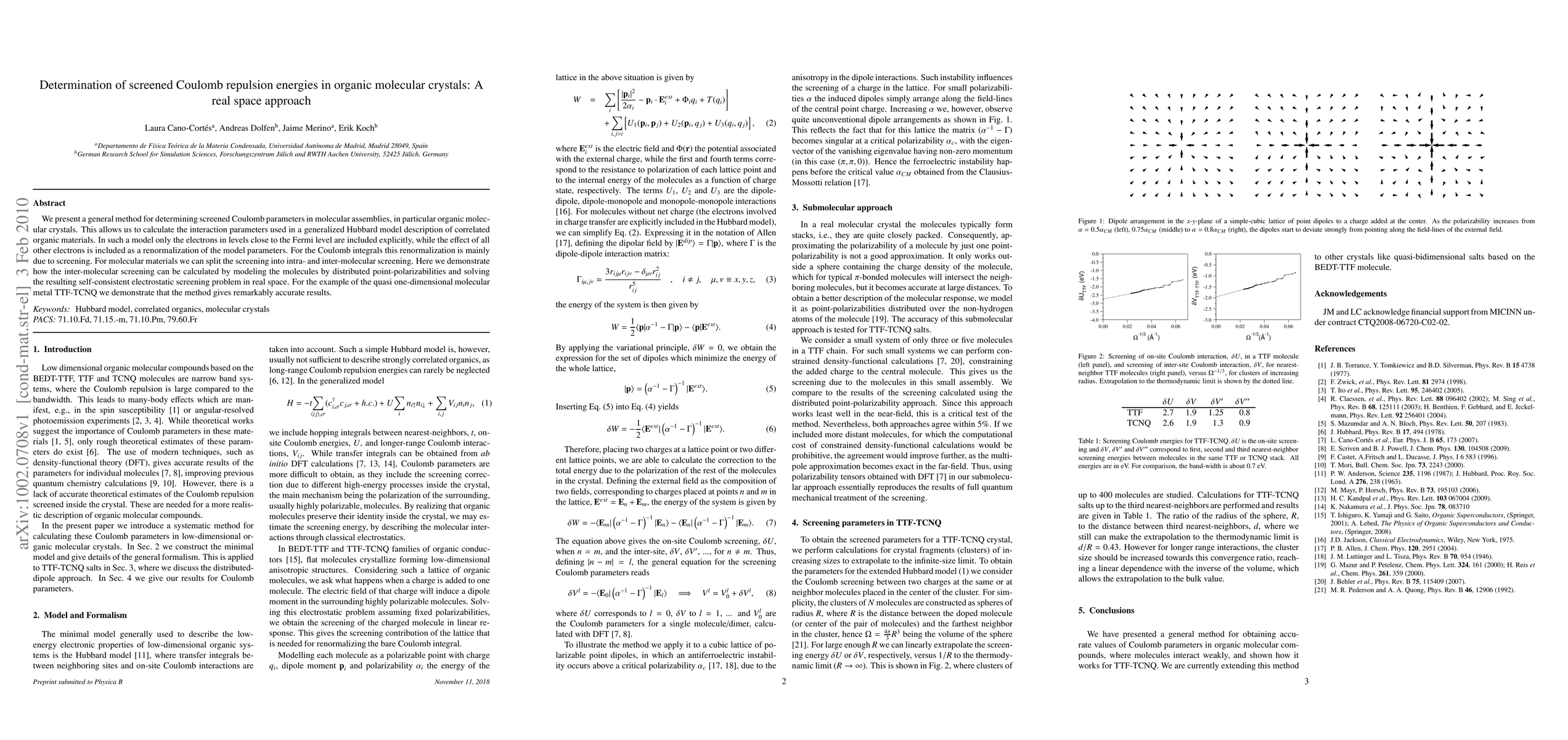 This paper introduces a method for calculating screened Coulomb repulsion energies in organic molecular crystals using a real space approach. The method models molecules with distributed point-polarizabilities to determine inter-molecular screening, demonstrating accuracy with the example of TTF-TCNQ.