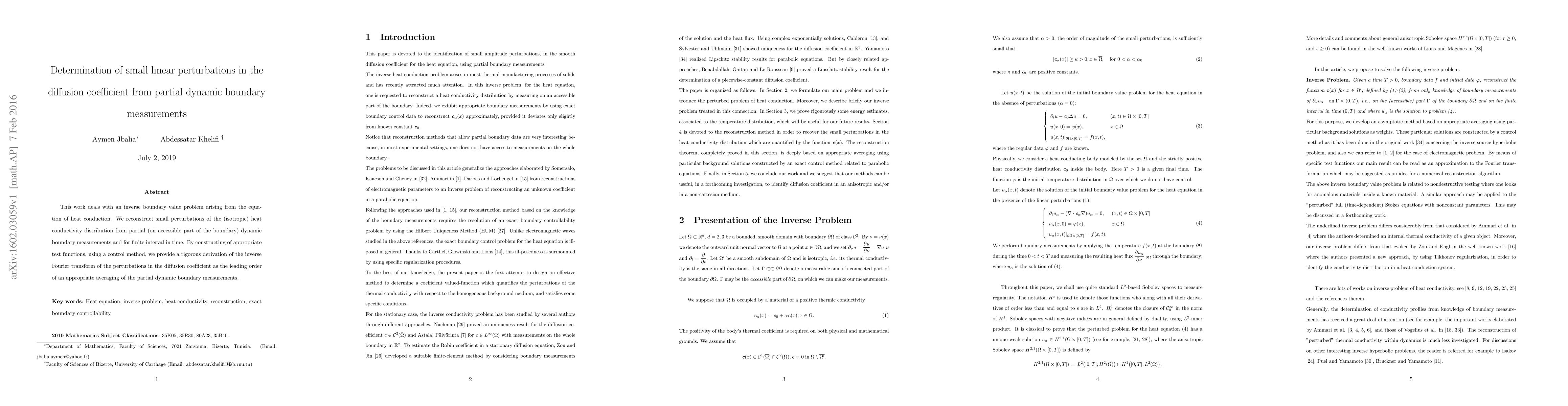 This paper addresses an inverse problem in heat conduction, reconstructing small linear perturbations in the diffusion coefficient from partial dynamic boundary measurements. It employs control methods and test functions to derive the inverse Fourier transform of the perturbations.