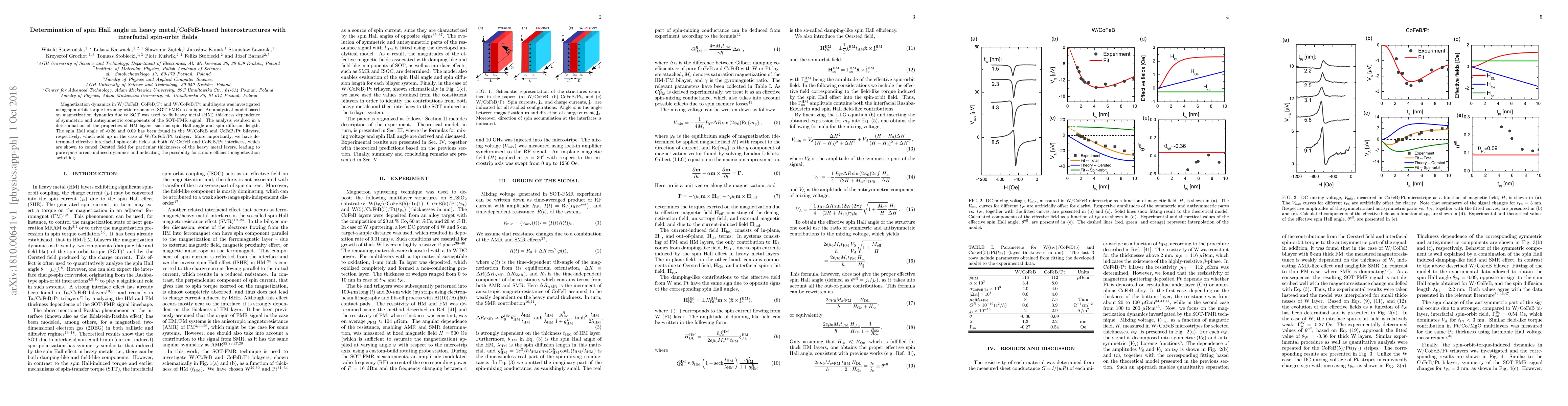 This study uses spin-orbit-torque ferromagnetic resonance to determine the spin Hall angle in W/CoFeB and CoFeB/Pt heterostructures, finding values of -0.36 and 0.09 respectively. It also identifies effective interfacial spin-orbit fields that cancel Oersted fields, suggesting more efficient magnetization switching.