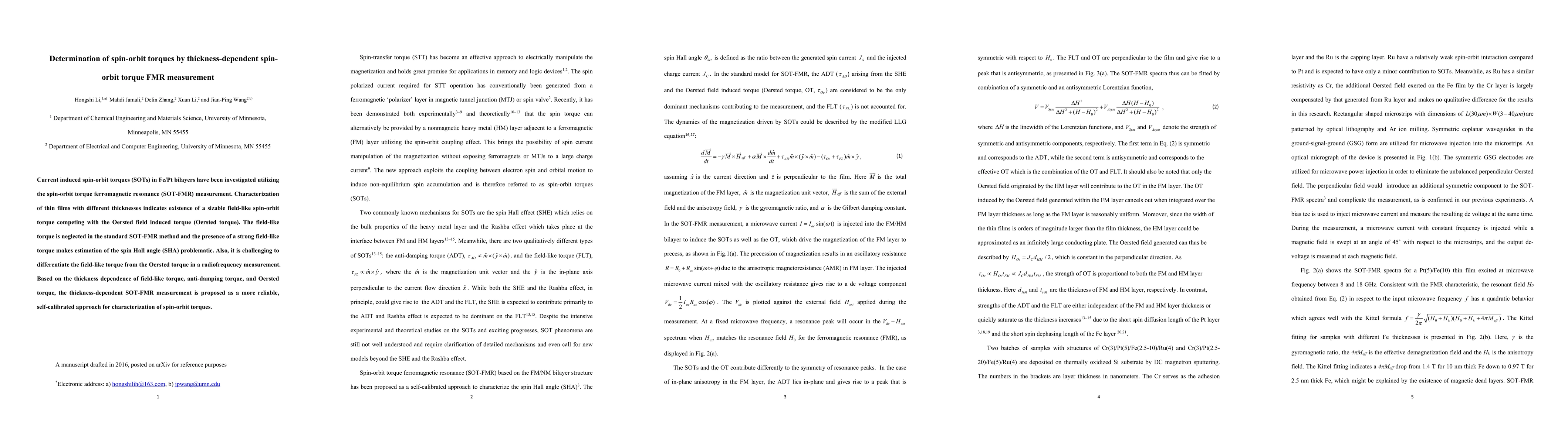 This paper investigates spin-orbit torques in Fe/Pt bilayers using a thickness-dependent spin-orbit torque ferromagnetic resonance (SOT-FMR) measurement. It reveals a significant field-like torque that complicates the estimation of the spin Hall angle and differentiates it from the Oersted torque, proposing a more reliable self-calibrated method for characterizing spin-orbit torques.