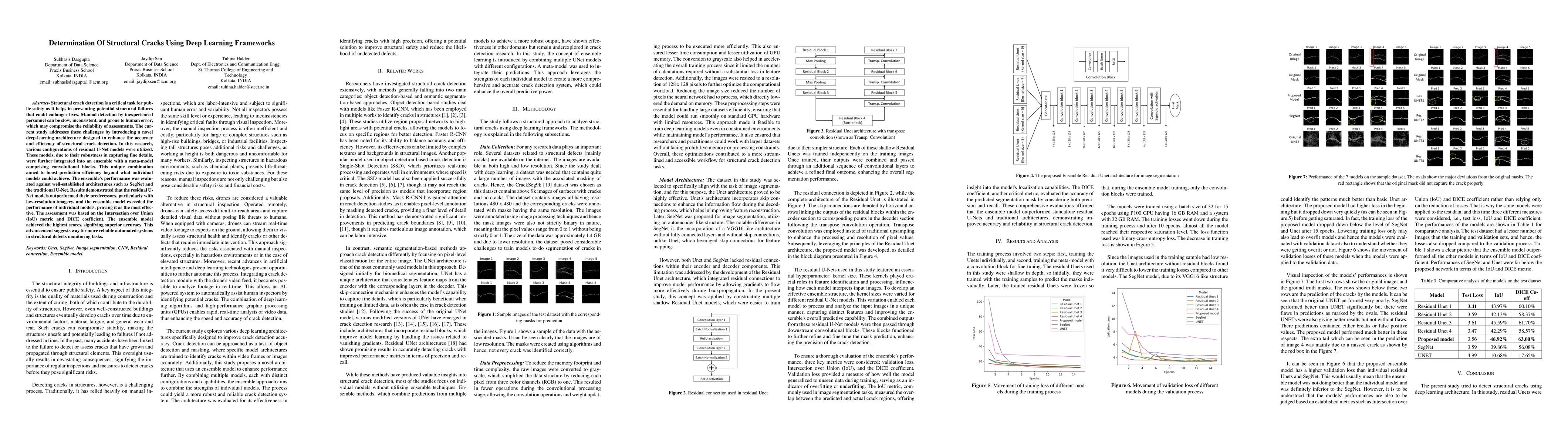Structural crack detection is a critical task for public safety as it helps in preventing potential structural failures that could endanger lives. Manual detection by inexperienced personnel can be slow, inconsistent, and prone to human error, which may compromise the reliability of assessments. The current study addresses these challenges by introducing a novel deep-learning architecture designed to enhance the accuracy and efficiency of structural crack detection. In this research, various configurations of residual U-Net models were utilized. These models, due to their robustness in capturing fine details, were further integrated into an ensemble with a meta-model comprising convolutional blocks. This unique combination aimed to boost prediction efficiency beyond what individual models could achieve. The ensemble's performance was evaluated against well-established architectures such as SegNet and the traditional U-Net. Results demonstrated that the residual U-Net models outperformed their predecessors, particularly with low-resolution imagery, and the ensemble model exceeded the performance of individual models, proving it as the most effective. The assessment was based on the Intersection over Union (IoU) metric and DICE coefficient. The ensemble model achieved the highest scores, signifying superior accuracy. This advancement suggests way for more reliable automated systems in structural defects monitoring tasks.
