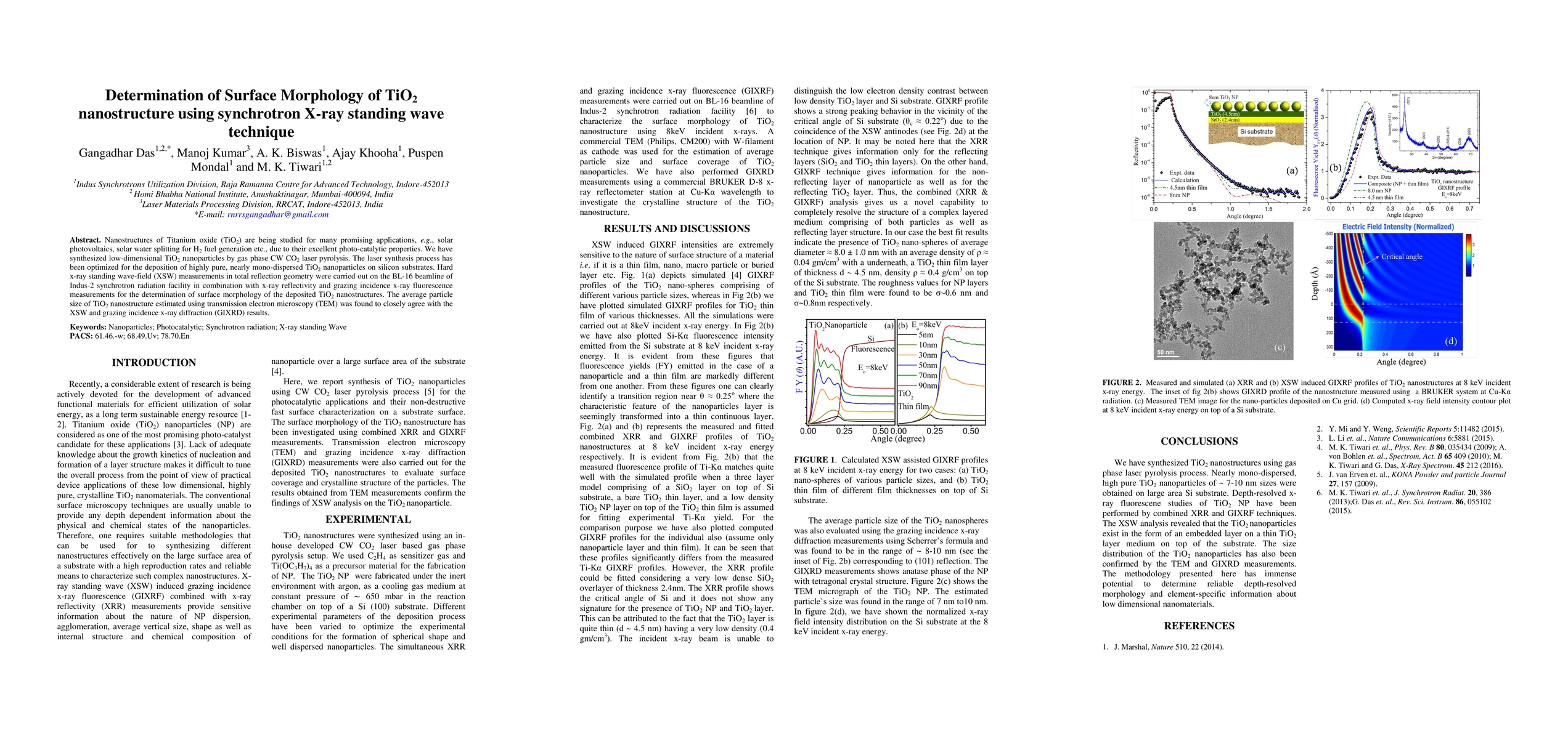 This study synthesizes low-dimensional TiO2 nanoparticles via gas phase CO2 laser pyrolysis, optimizing the process for high purity and mono-dispersity. Synchrotron X-ray standing wave technique, combined with x-ray reflectivity and fluorescence, was used to determine the surface morphology, with results corroborated by TEM and GIXRD.