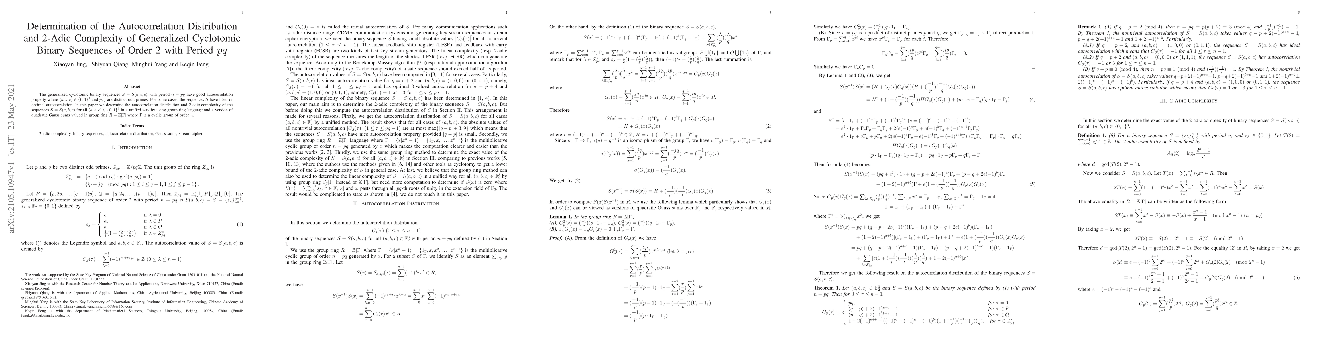 This paper determines the autocorrelation distribution and 2-adic complexity of generalized cyclotomic binary sequences with period pq, a type of sequence with good autocorrelation properties, in a unified way using group ring language and quadratic Gauss sums.