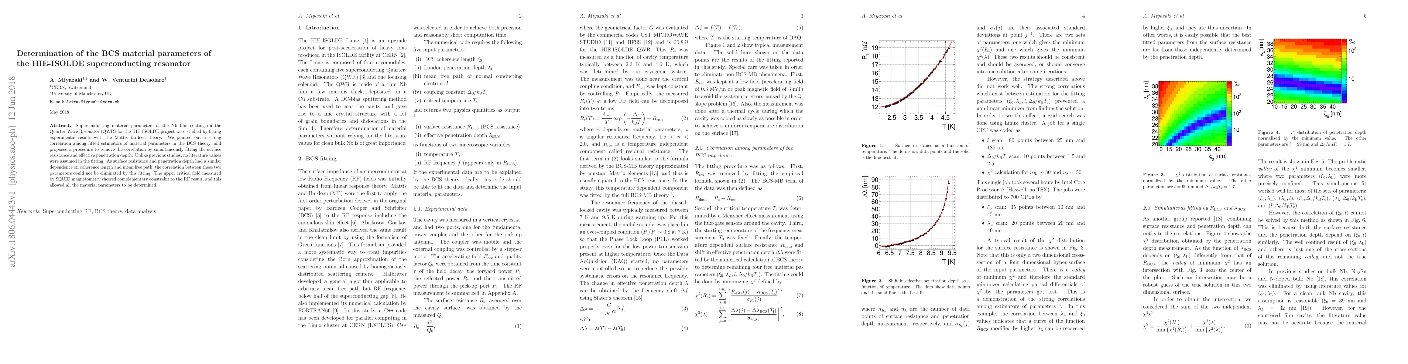 Superconducting material parameters of the Nb film coating on the Quarter-Wave Resonator (QWR) for the HIE-ISOLDE project were studied by fitting experimental results with the Mattis-Bardeen theory. We pointed out a strong correlation among fitted estimators of material parameters in the BCS theory, and proposed a procedure to remove the correlation by simultaneously fitting the surface resistance and effective penetration depth. Unlike previous studies, no literature values were assumed in the fitting. As surface resistance and penetration depth had a similar dependence on coherence length and mean free path, the correlation between these two parameters could not be eliminated by this fitting. The upper critical field measured by SQUID magnetometry showed complementary constraint to the RF result, and this allowed all the material parameters to be determined.