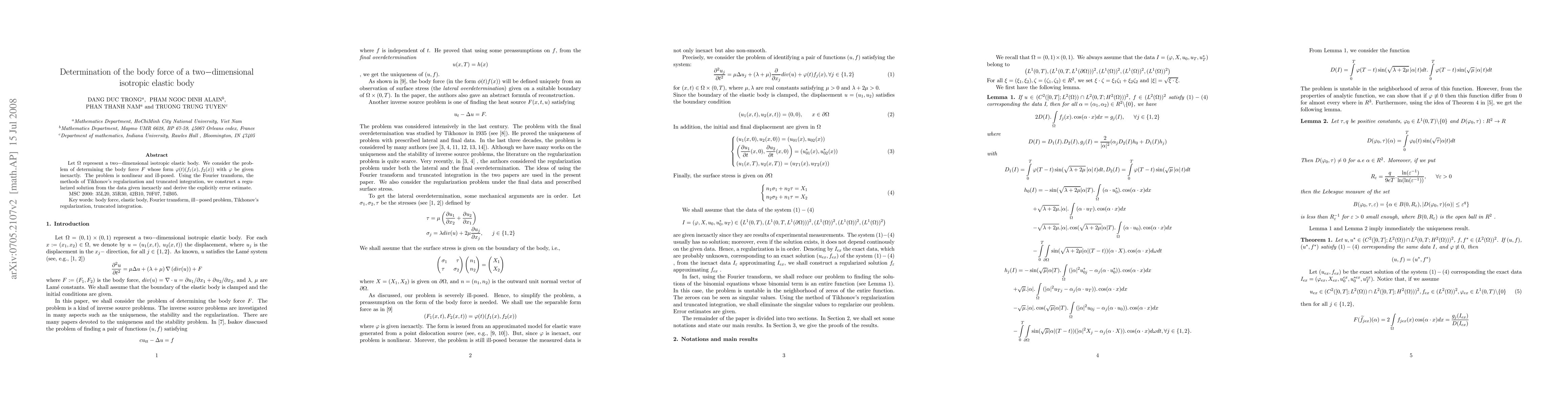 Let $\Omega$ represent a two$-$dimensional isotropic elastic body. We consider the problem of determining the body force $F$ whose form $\phi(t)(f_1(x),f_2(x))$ with $\phi$ be given inexactly. The problem is nonlinear and ill-posed. Using the Fourier transform, the methods of Tikhonov's regularization and truncated integration, we construct a regularized solution from the data given inexactly and derive the explicitly error estimate. Numerical part is given