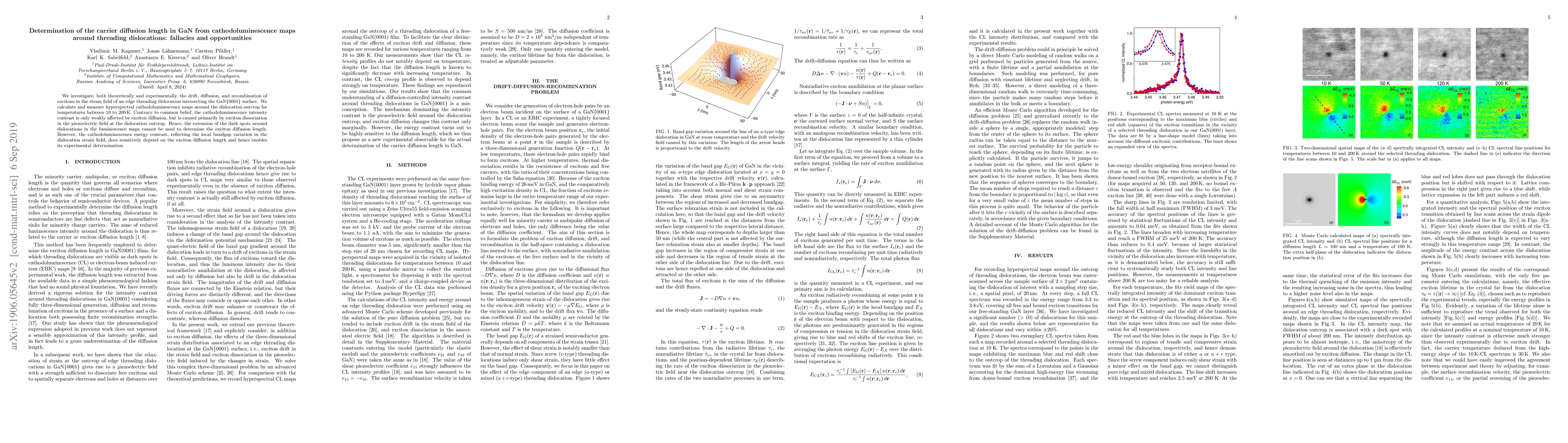 This paper explores the diffusion and recombination of excitons near threading dislocations in GaN using cathodoluminescence maps. Contrary to common belief, the cathodoluminescence intensity is mainly due to exciton dissociation in the piezoelectric field rather than diffusion, thus precluding the use of dark spots for determining exciton diffusion length. However, the energy contrast in the luminescence maps can be used to accurately determine the exciton diffusion length.