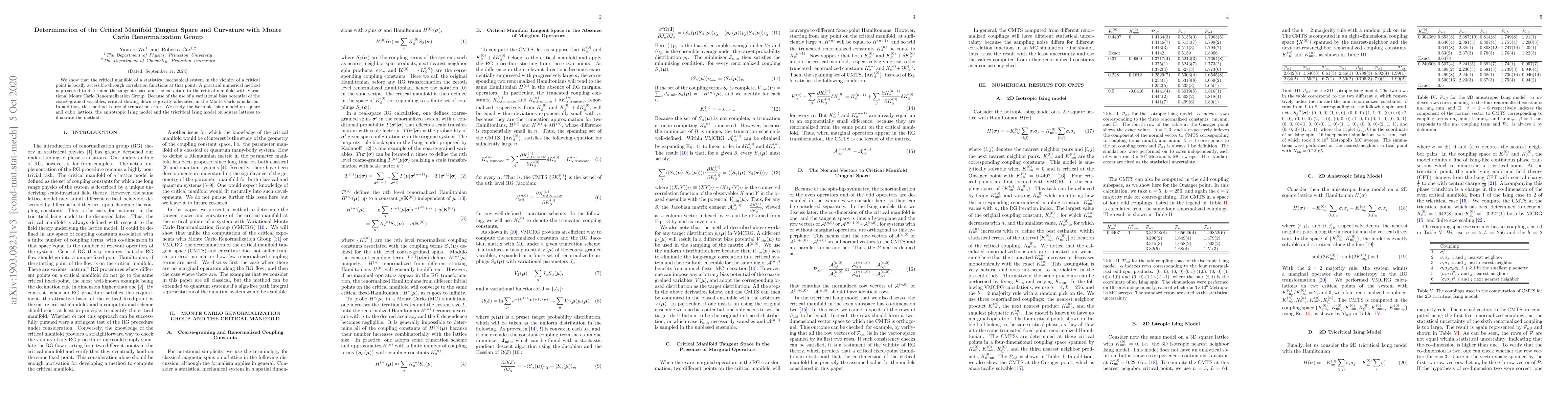 We show that the critical manifold of a statistical mechanical system in the vicinity of a critical point is locally accessible through correlation functions at that point. A practical numerical method is presented to determine the tangent space and the curvature to the critical manifold with Variational Monte Carlo Renormalization Group. Because of the use of a variational bias potential of the coarse-grained variables, critical slowing down is greatly alleviated in the Monte Carlo simulation. In addition, this method is free of truncation error. We study the isotropic Ising model on square and cubic lattices, the anisotropic Ising model and the tricritical Ising model on square lattices to illustrate the method.